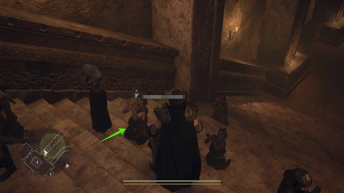 Когда начнётся молитва, поднимитесь по ступенькам и осмотритесь. Справа вы увидите мужчину с завязанными волосами и накидкой через плечо. Если присмотреться, когда он поднимает руки, то можно заметить порез на одной из них. Подойдите к нему и зажмите клавишу «Схватить».