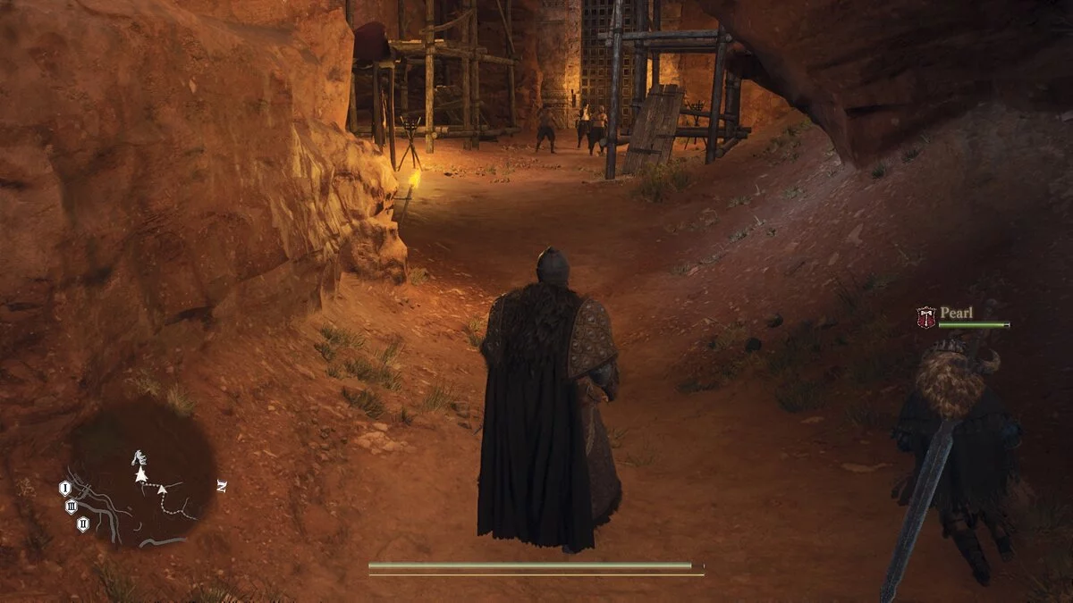 Бегите по следам Хьюго в пещеру, где снова стартует катсцена. Ворота слева будут заперты, поэтому идите в проход справа. Выбравшись из пещеры, вы попадёте на территорию основного лагеря бандитов. В этот же момент появится капитан стражи. Избавьтесь от всех врагов в этой области и осмотритесь. Здесь можно отыскать несколько сундуков.
