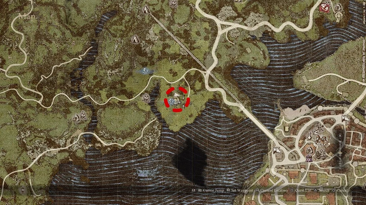 К западу от Безымянной деревни есть река, на берегу которой руины. От них идите на юг, чтобы увидеть разрушенную статую, за ней сундук.