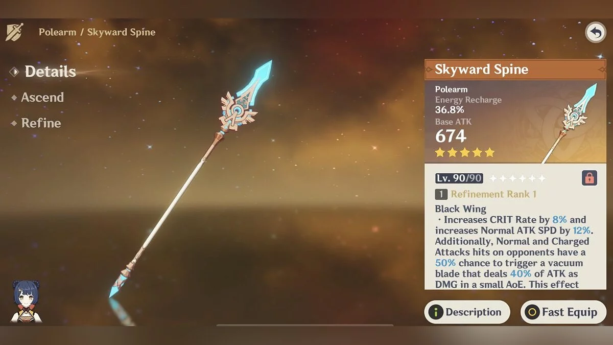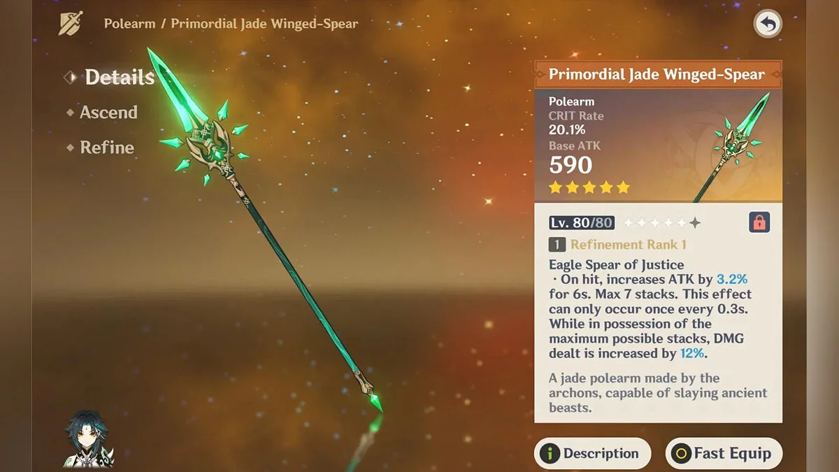 Простой, но эффективный способ резко повысить эффективность простых ударов копьём. Получить этот набор можно в качестве награды за победу над такими боссами как Синьора, Чайльд, Ужас Бури, Волчий лорд, Древний геовишап, Океанид, Крио папоротник, Пиро орхидея и Гипостазисы различных стихий.