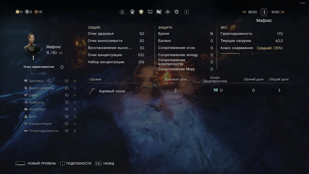 - Характеристики — общая информация о параметрах вашего персонажа. При повышении уровня здесь вы можете вкачивать «Очки характеристик»;