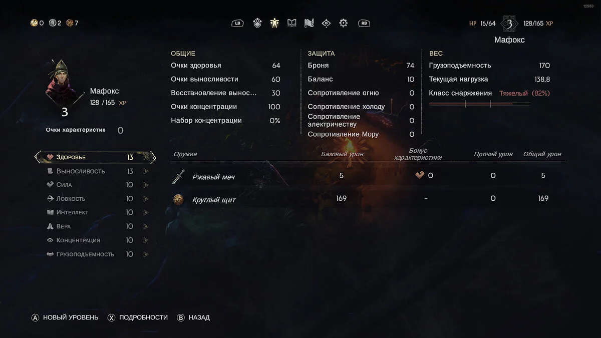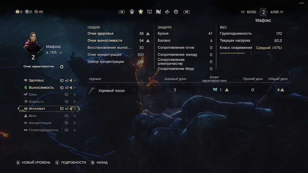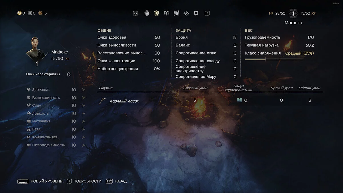 Параметры сила, ловкость, интеллект и вера нужны только для усиления соответствующего снаряжения. Концентрация — важная характеристика, но вам нужно много очков, чтобы ощутить усиление, поэтому вначале лучше игнорировать её. Грузоподъёмность следует поднимать по мере прохождения игры, чтобы не менять ваш стиль игры от перегрузки в инвентаре.