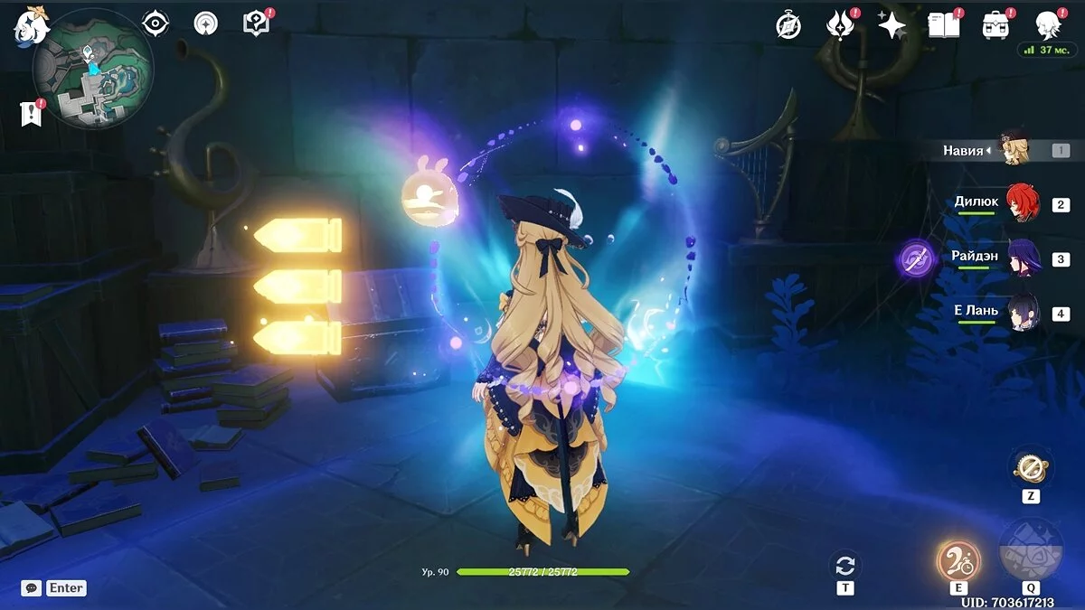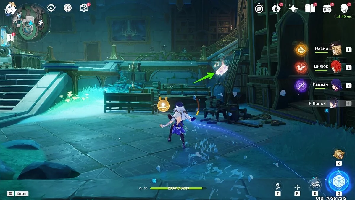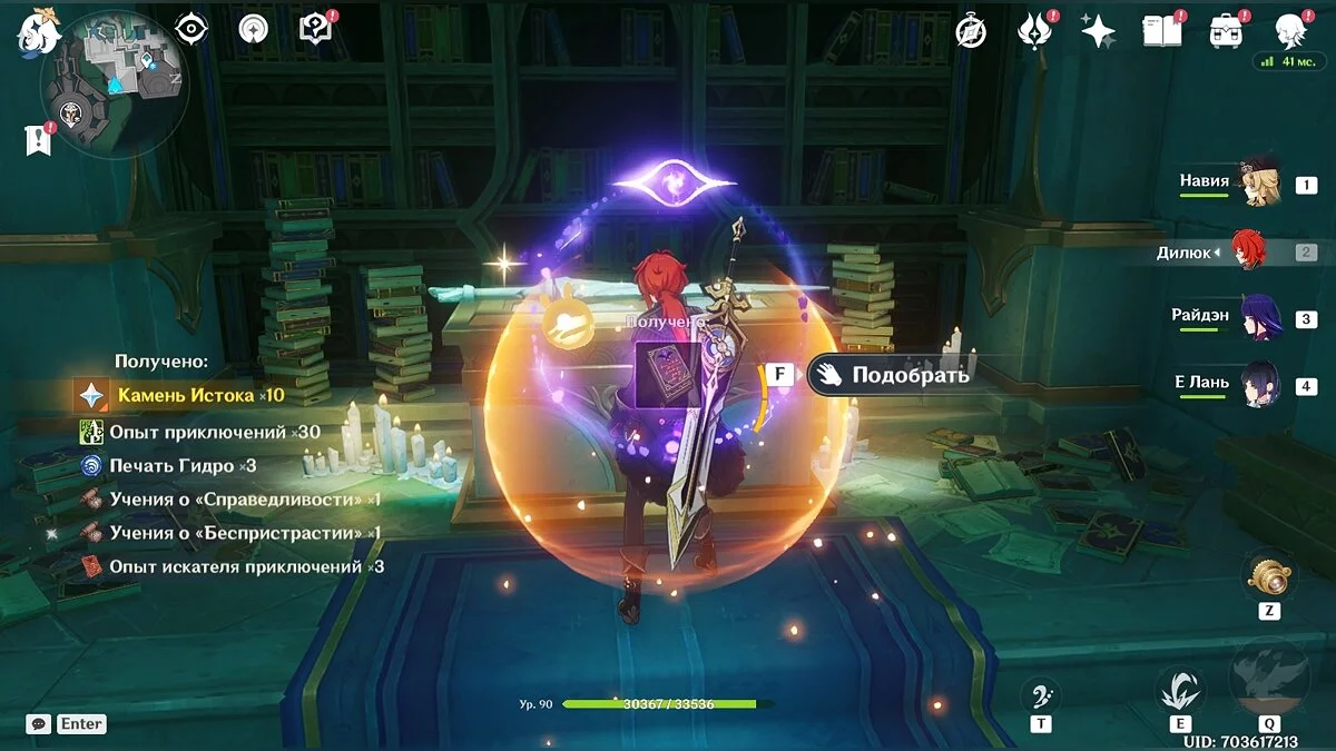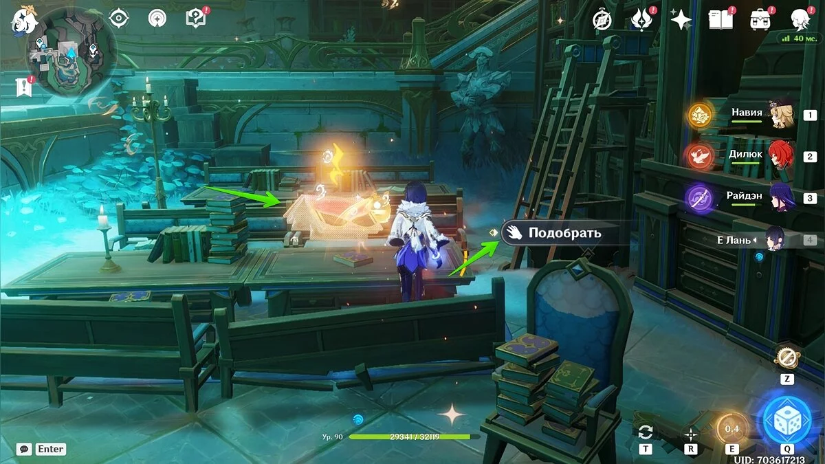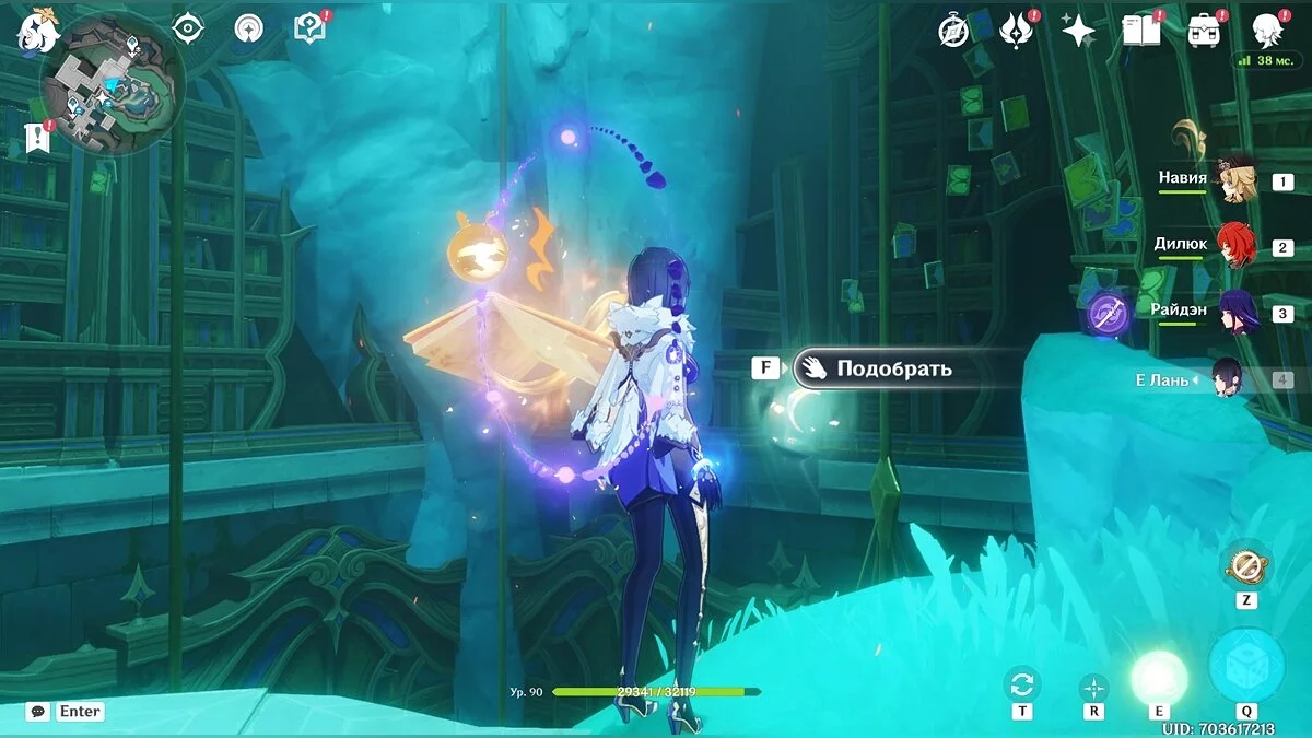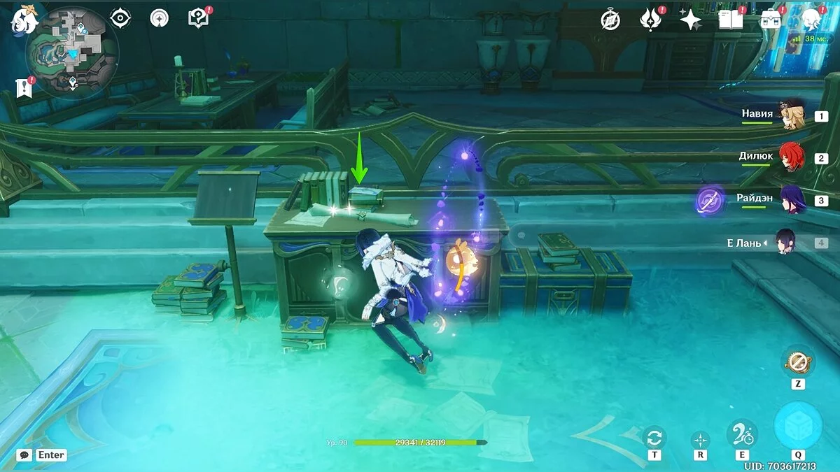 Так вы окажетесь в помещении, которое очень напоминает библиотеку. Чтобы отыскать первый фрагмент, нужно будет найти потерянные гримуары. Они находятся здесь же и выглядят как парящие полупрозрачные книги со значком ноты. Подобрать их можно при помощи активации новой способности: нажмите клавишу T, чтобы переключить стандартный элементальный навык героя, затем подойдите к прозрачной книге и нажмите E.
