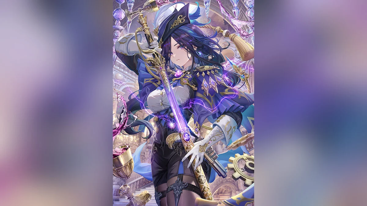 Харан гэппаку фуцу. Ещё один меч, который неплохо сочетается с умениями нашей героини. Его атака — 47-674 единиц, а шанс нанесения критического урона с 7,2-33,1%. Оружие обладает бонусом ко всем стихиям в размере 12-24%. Когда другие персонажи используют элементальный навык, хозяин меча получает 1 уровень Волны-шипа. Эффект может складываться до 2-х раз. Когда сама дуэлянтка активирует Охоту на тьму, её атака повысится на 20-40% за каждый уровень на 8 секунд. Получить этот меч можно при помощи молитвы Воплощение божества.