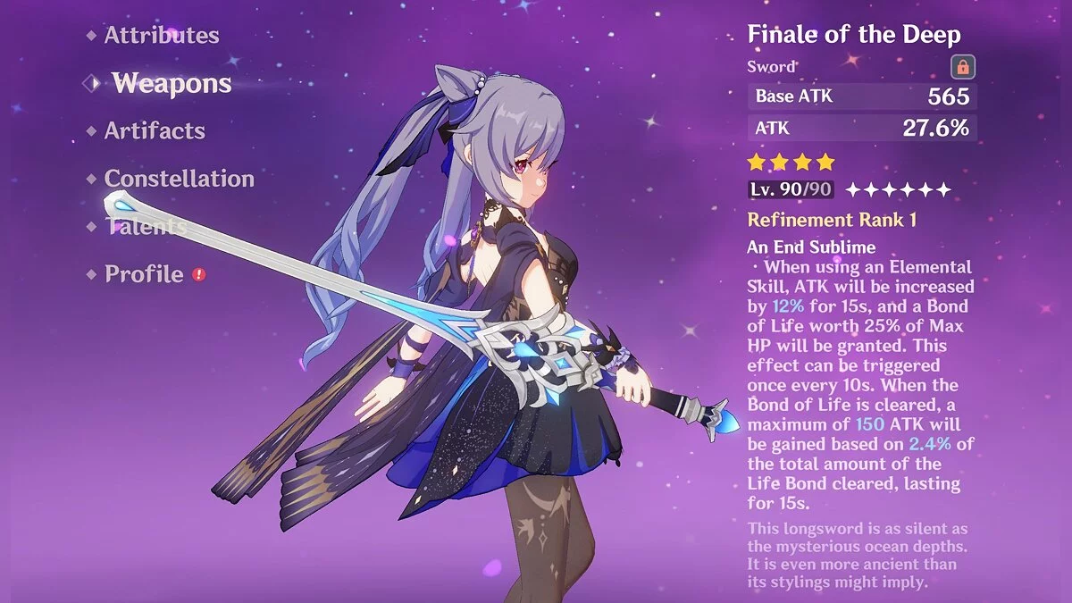 Грандиозный финал глубин. Четырёхзвёздочный меч, который можно изготовить самому. Атака — 44-565 единиц, а бонус к ней составляет 6-27,6%. Применение элементального навыка увеличивает урон на 12-24% в течение 15 секунд. При этом героиня получает Долг жизни, равный 25% от максимума её здоровья. Эффект может возникнуть 1 раз в 10 секунд. Когда Долг жизни снимается, сила атаки повышается на 2-4,8% от числа утраченных очков (но не более 150-300 единиц) на протяжение 15 секунд.
