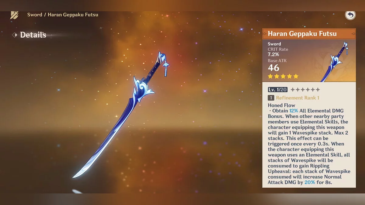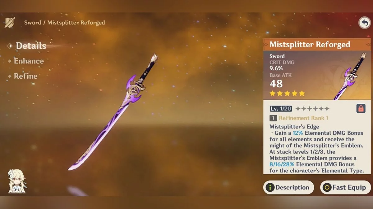Рассекающий туман. Пятизвёздочный одноручный меч со ставкой на мощные атаки. Его базовый урон составляет 47-674 единиц, а шанс критического попадания 9.6-44.1%. Стихийные атаки становятся эффективнее на 12-24%. Если персонаж наносит стихийный урон, применяет взрыв стихий или его энергия становится меньше 100%, он получает Эмблему рассекателя тумана (до трёх штук). За первую его урон увеличивается на 8-16%, за вторую — на 16-32%, а за третью — на 28-56%.