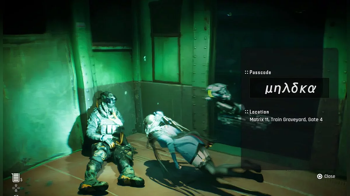 Двенадцатый пароль. Контейнер с различными материалами вы обнаружите на свалке. Попасть туда можно после того, как вы пройдёте через железнодорожный мост и спуститесь вниз на лифте. Код находится наверху, рядом с закрытой дверью.
