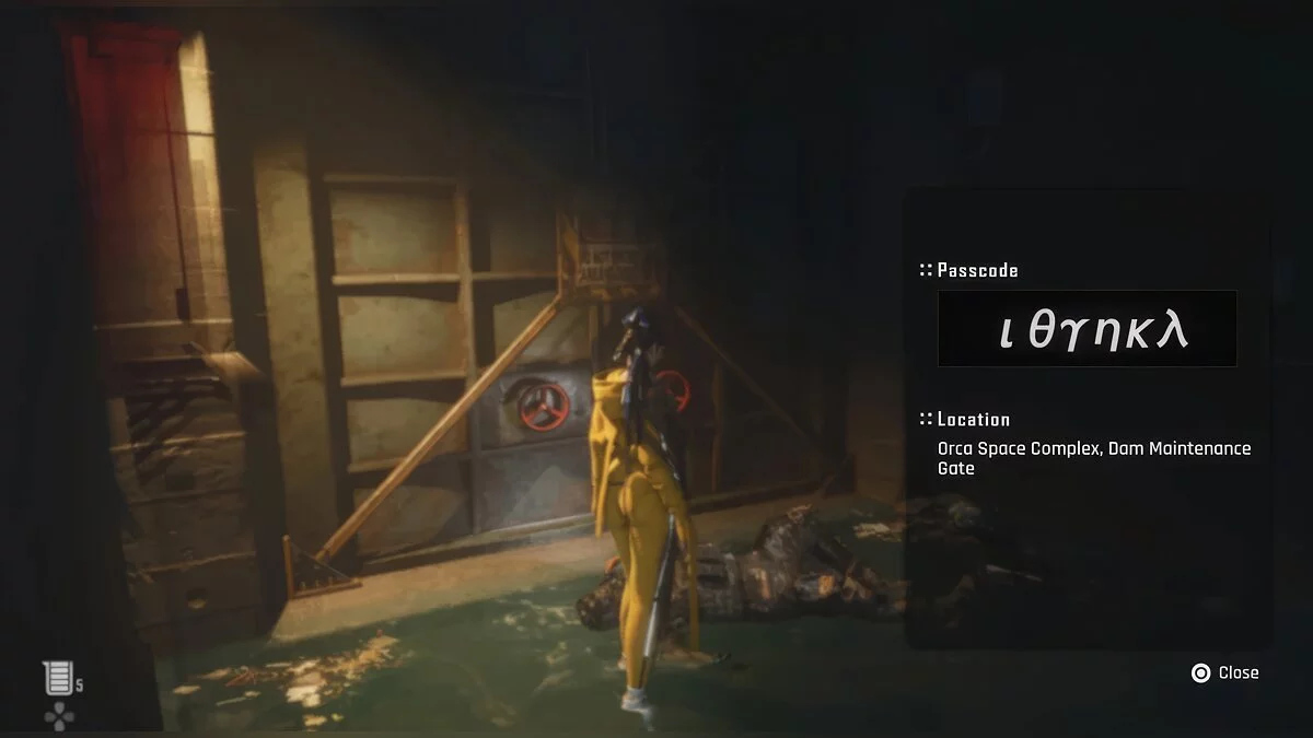 Четвёртый пароль. Когда вы окажетесь на территории Затопленного коммерческого сектора, обратите внимание на ворота, которые находятся справа от монорельса. Чтобы найти код, двигайтесь к жёлтой платформе и одолейте пришельца, после чего изучите его тело.