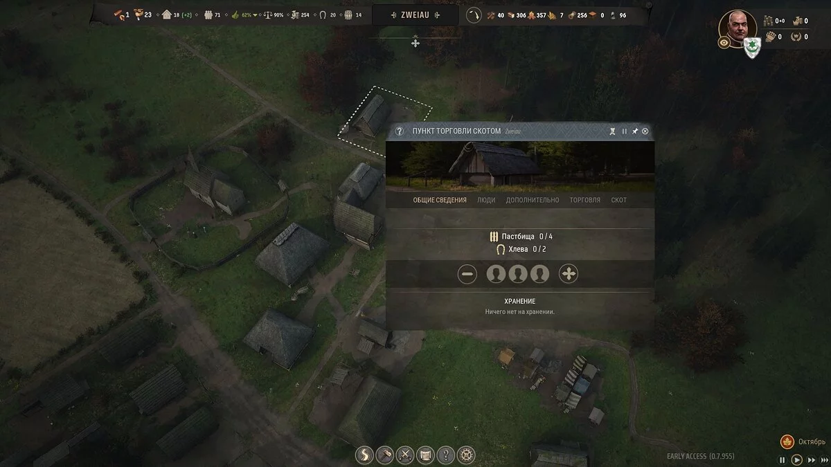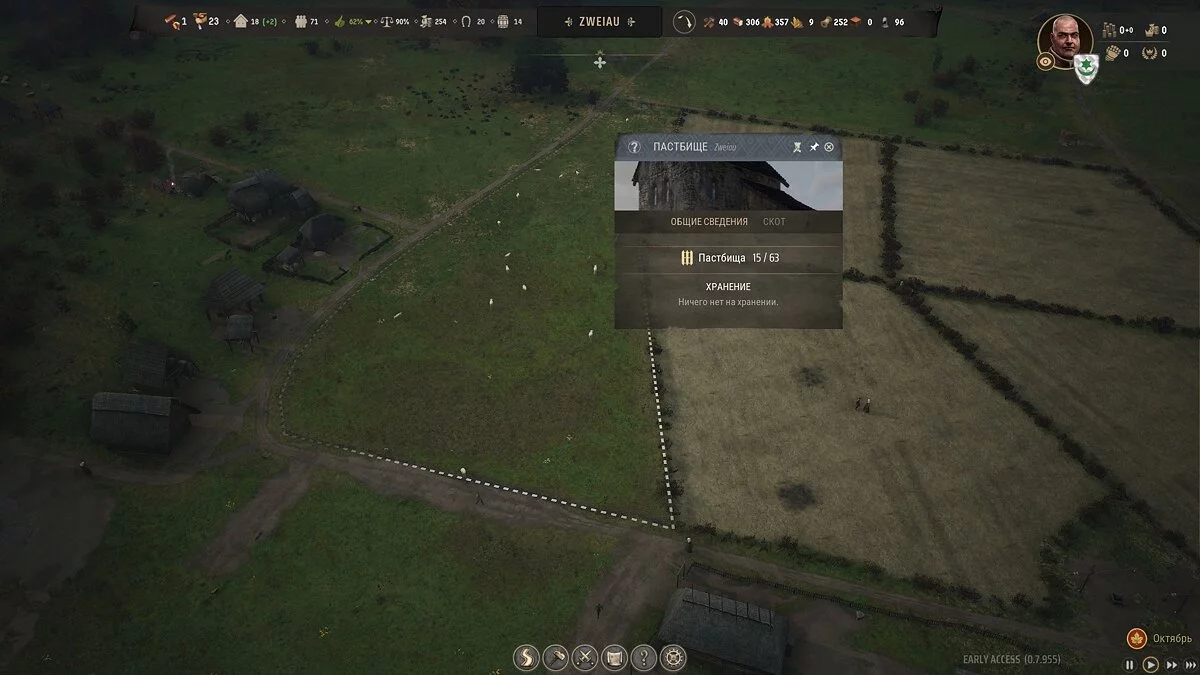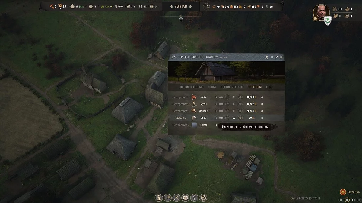 На данном этапе не нужно распределять жителей, так как самих овец вы не получите из воздуха — их можно только купить за достаток региона. Каждая овечка стоит 25-30 ед. достатка, то есть денег нужно будет много, и без продажи маржинальных товаров соседним регионам не обойтись. Следовательно, сперва наладьте торговлю, а потом уже думайте про овцеводство. К счастью, вам не нужно устанавливать торговый маршрут для импорта скота.