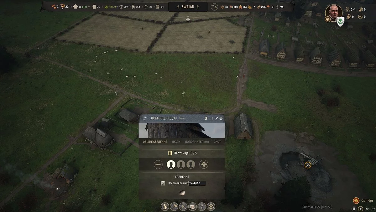 Со старта потянуть такую задачу будет сложно, лучше делать всё не спеша и поэтапно. Завершив начальное развертывание, выберите место в стороне от города и площадей, пригодных для посева растений. И тут уже стройте большое пастбище и дом овцеводов около неё.