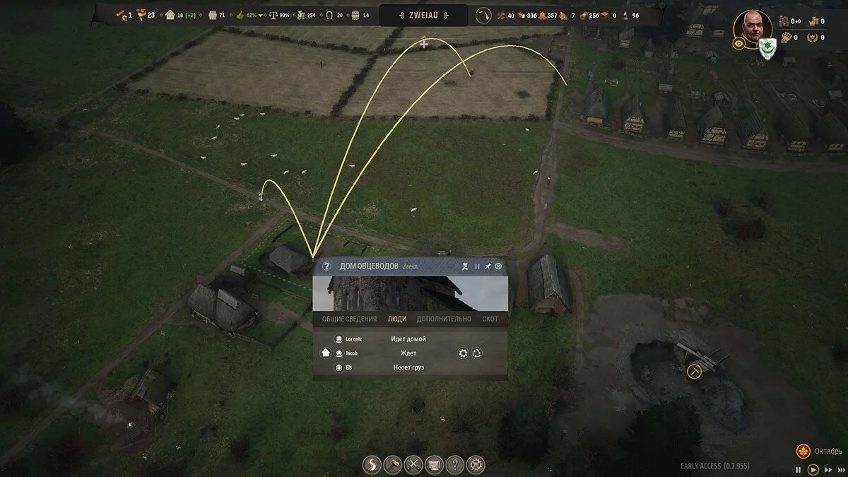 Завершив импорт, процесс станет самоподдерживающимся — число овец будет расти каждый месяц, так как игра в раннем доступе не учитывала их возраст или падеж от болезней. Импортировав 10 овец, через год их численность возрастет до 50 и более. Теперь вы можете назначить три семьи в дом овцеводов и построить ткацкую мастерскую.