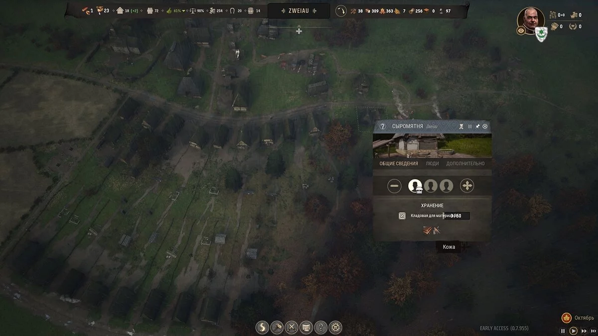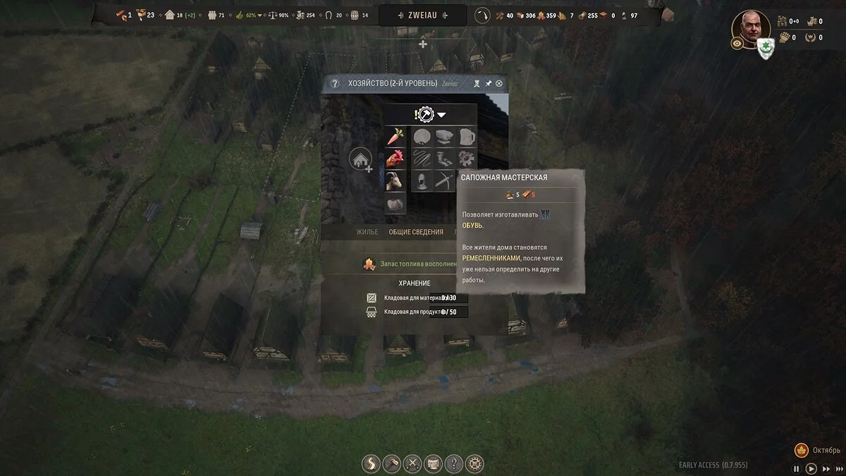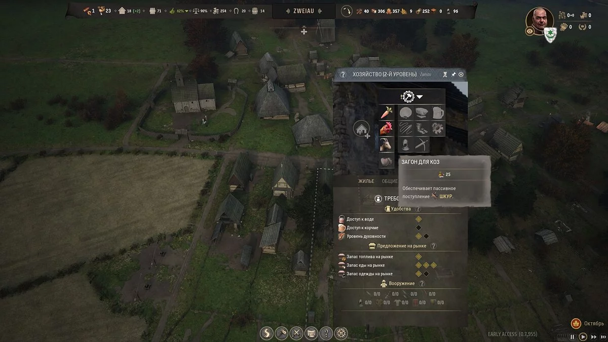 Такой вариант крайне ограничен биоразнообразием в ближайшем лесу, в какой-то момент животных перестанет хватать на нужды поселения. Придется модернизировать приусадебные участки у части жилищ. Уже на первом уровне вы можете пристроить к земельному участку загон для коз за 25 единиц достатка региона, тем самым обеспечив постоянный приток шкур, а значит, и кожи.