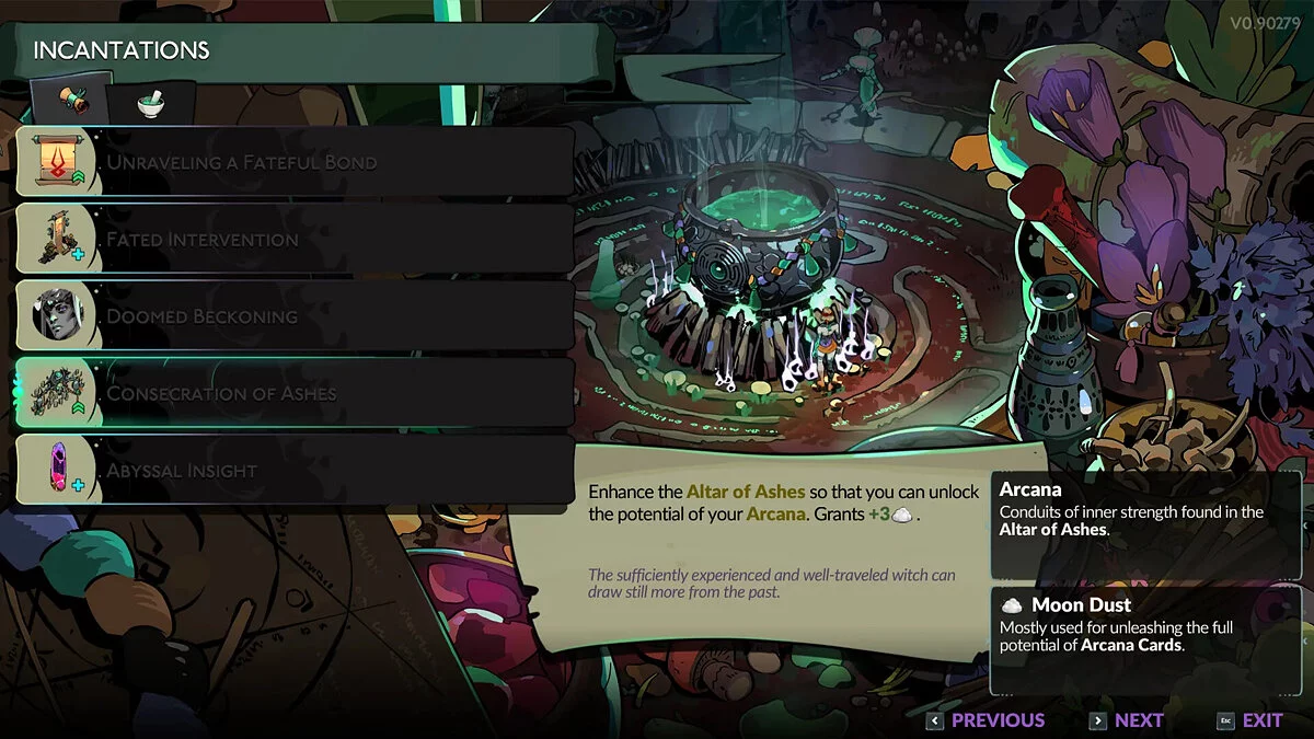 Для разблокировки этих карт требуется пепел (Ashes), также они различаются по редкости. Чтобы применить больше карт одновременно, вам необходимо обновить счетчик Хватки (Grasp) с помощью Воли (Psyche). Оба эти ресурса можно собрать в Эребе (Erebus) или найти в магазине торговца (Wrecthed Broker).