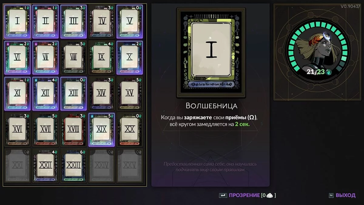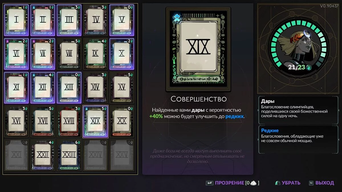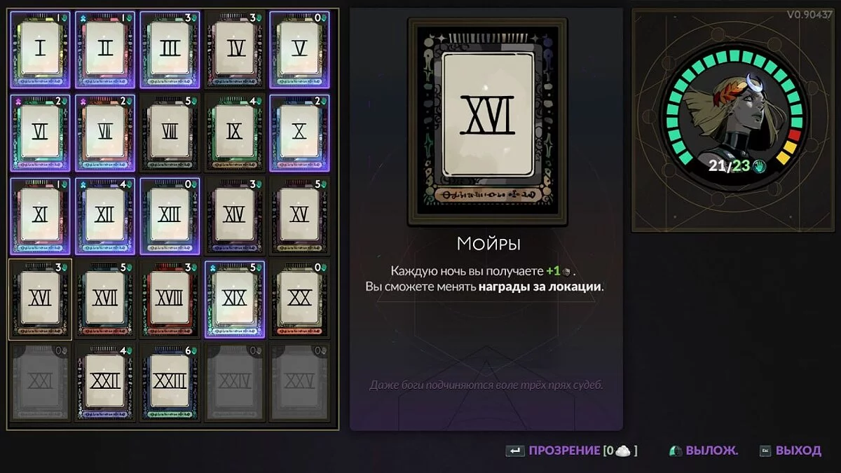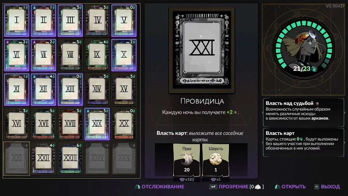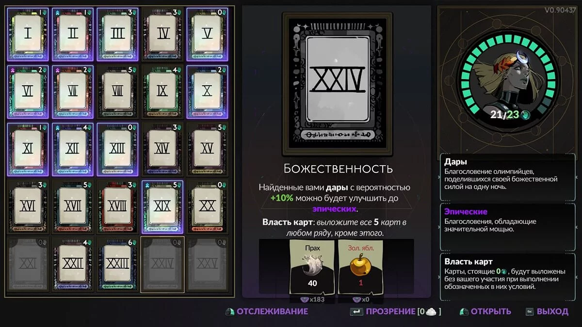 XXIV — Божественность (Divinity). Найденные вами дары с вероятностью +10% можно будет улучшить до эпических. Власть карт: выложите все 5 карт в любом ряду, кроме этого.