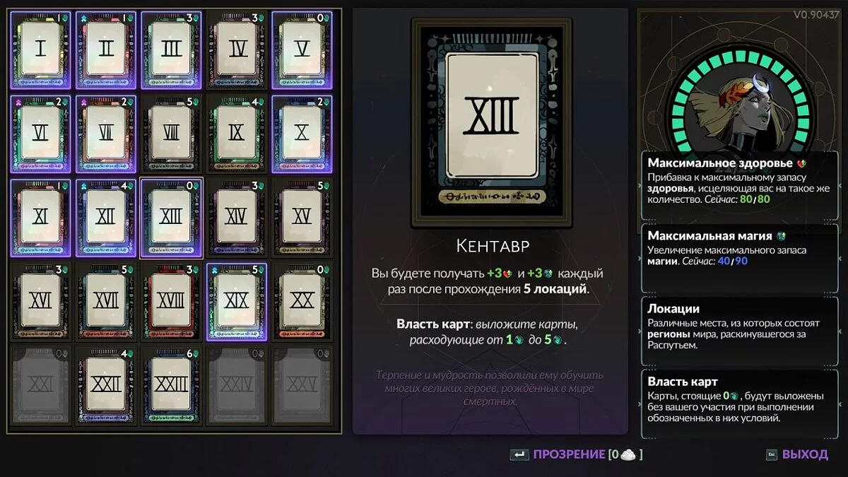 XIII — Кентавр (The Centuar). Вы будете получать +3 к здоровью и магии каждый раз после прохождения 5 локаций. Власть карт: выложите карты, расходующие от 1 до 5 магии.