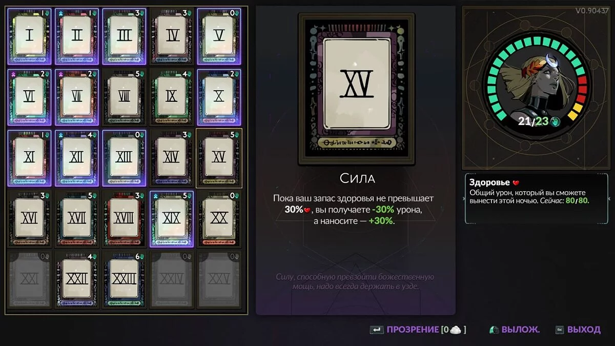 XV — Сила (Strength). Пока ваш запас здоровья не превышает 30%, вы получаете -30% урона, а наносите +30%.