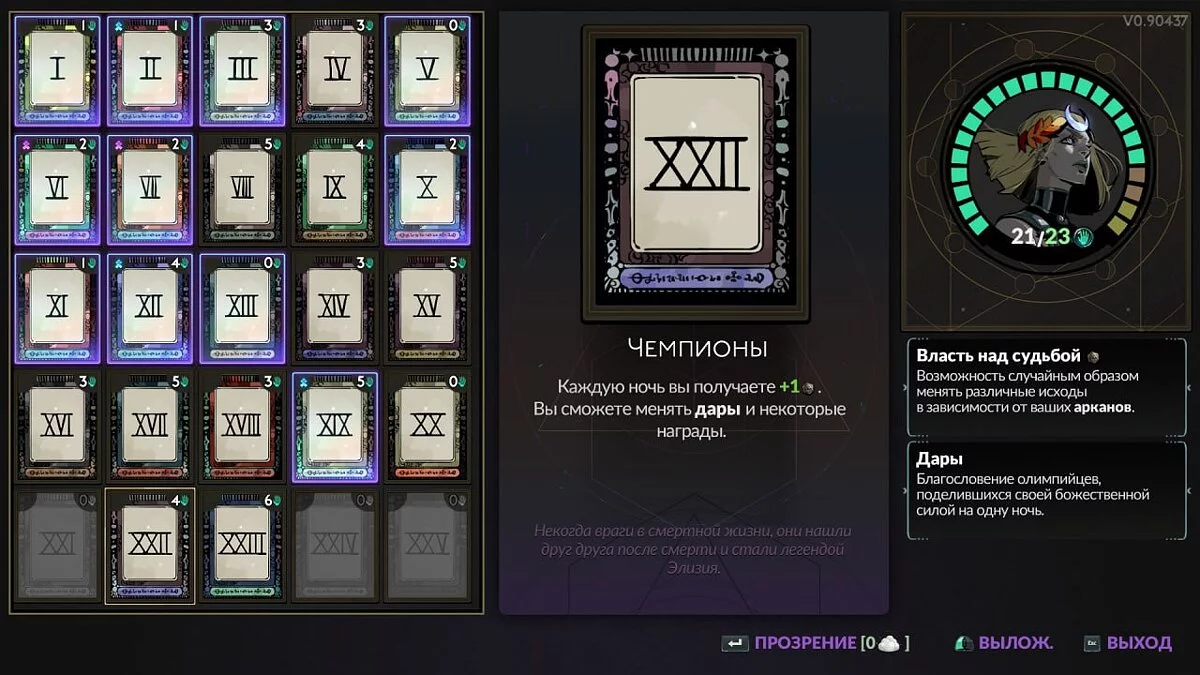 XXII — Чемпионы (The Champions). Каждую ночь вы получаете +1 власть над судьбой. Вы сможете менять дары и некоторые награды.