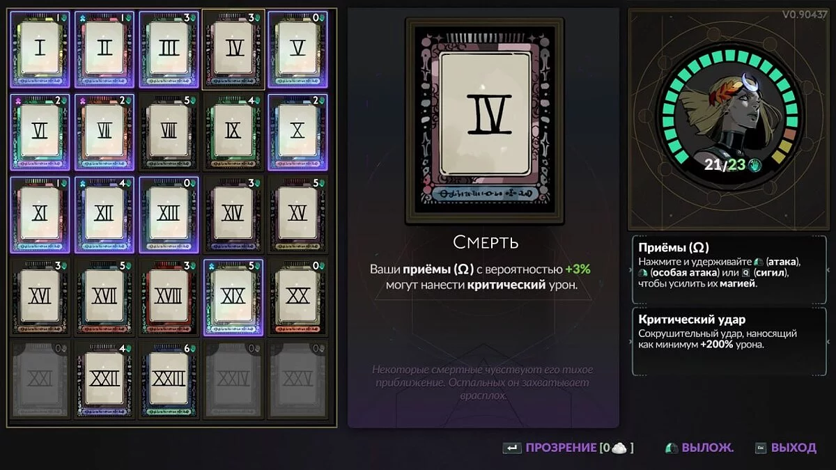IV — Смерть (Death). Ваши омега-приемы с вероятностью +3% могут нанести критический урон.