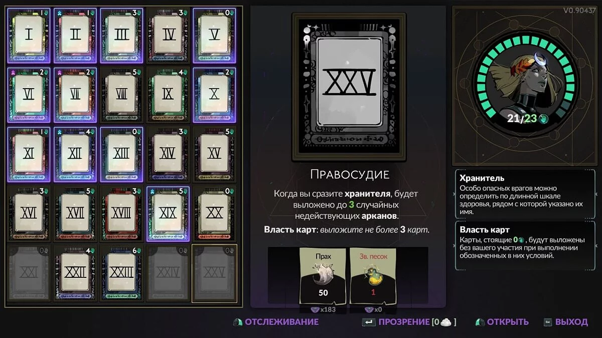 XXV — Правосудие (Judgement). Когда вы сразите хранителя (Guardian), будет выложено до 3 случайные недействующих арканов. Власть карт: выложите не более 3 карт.