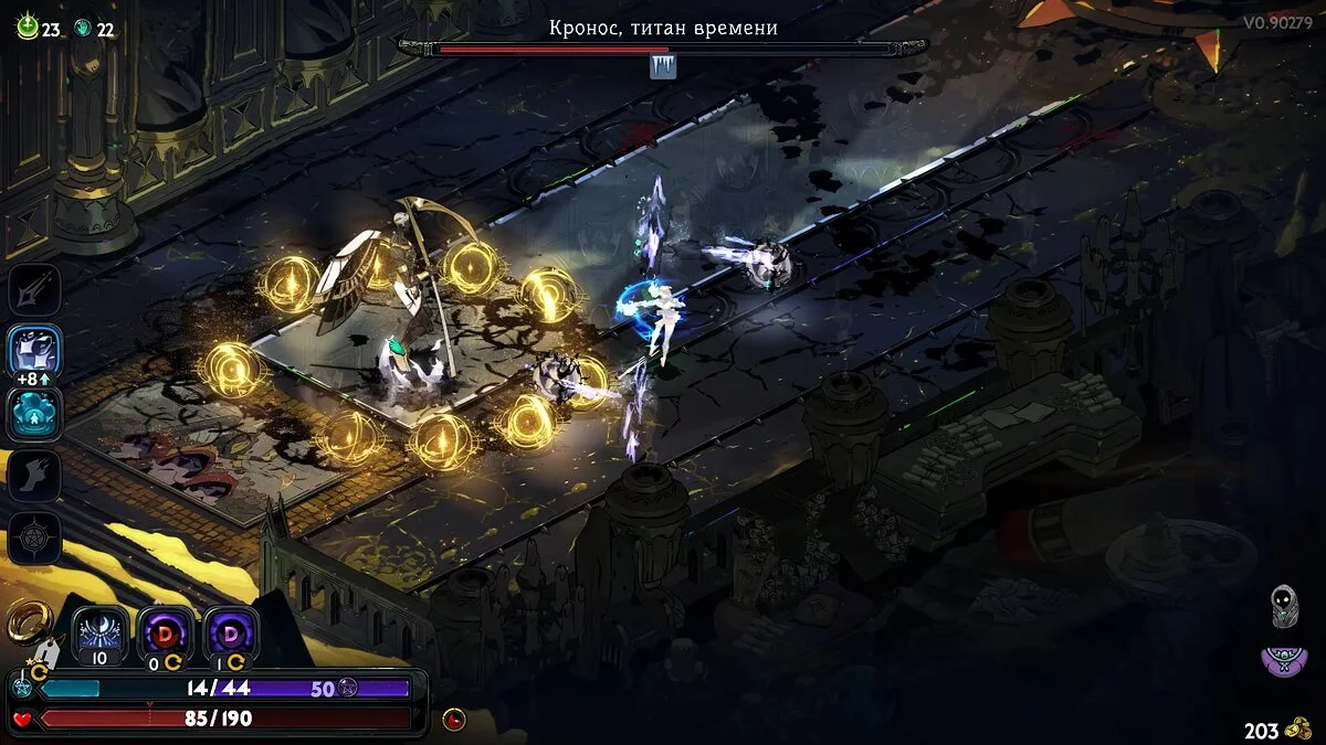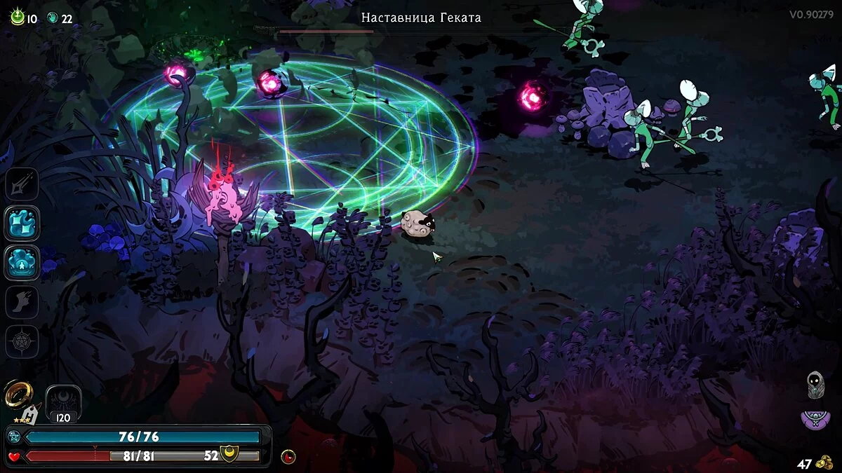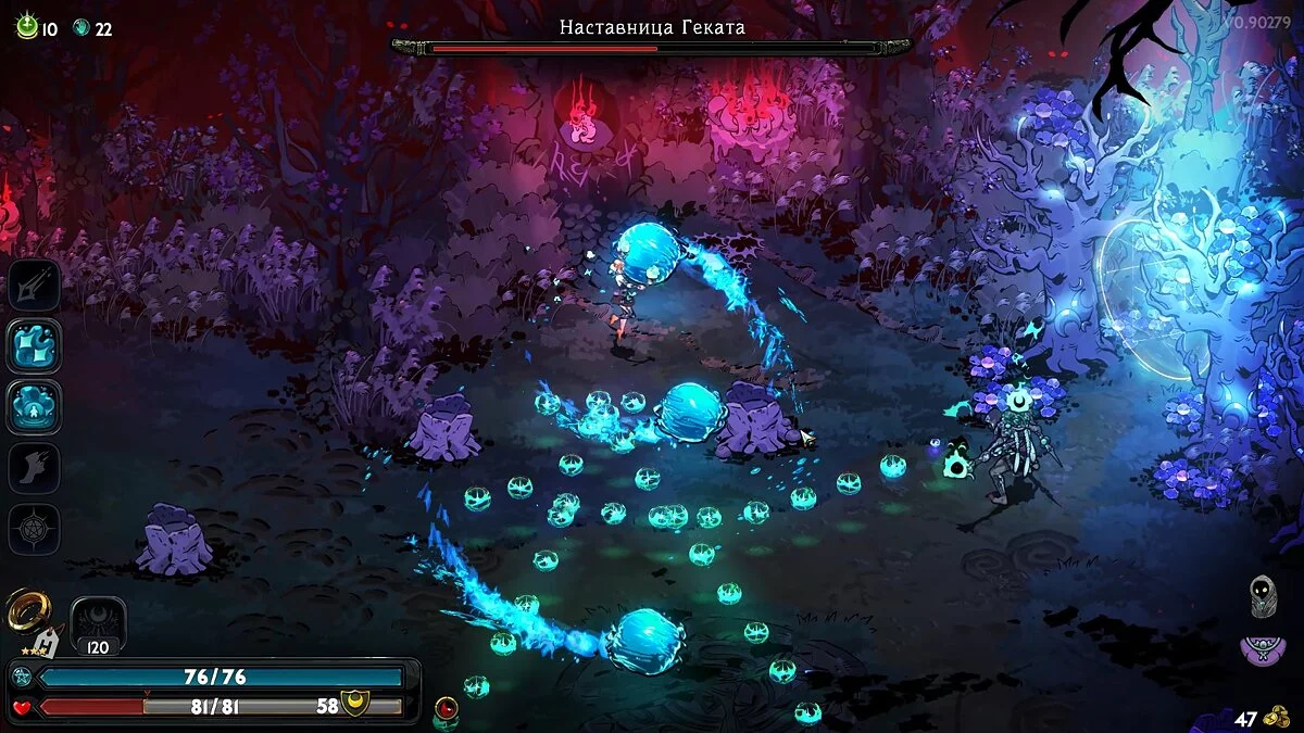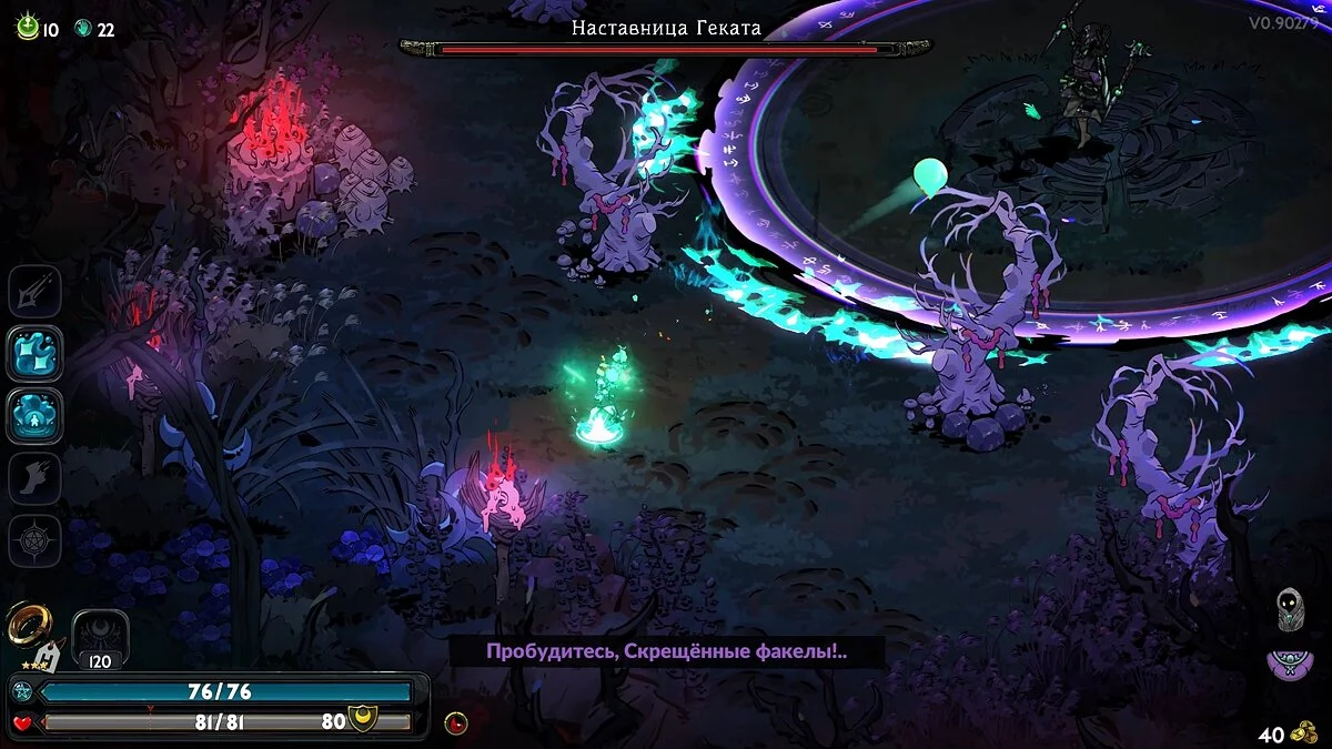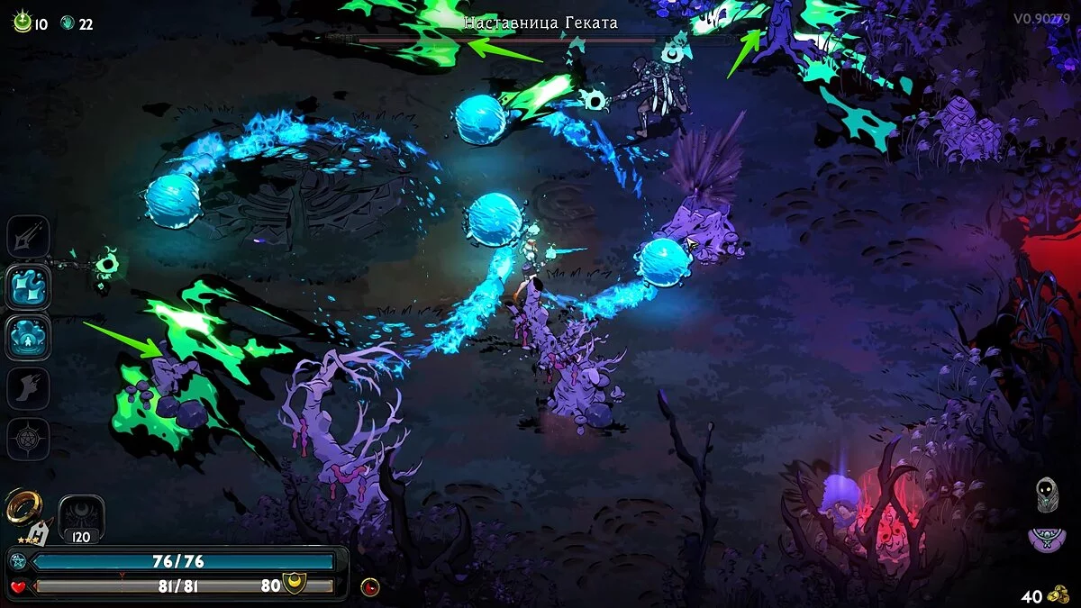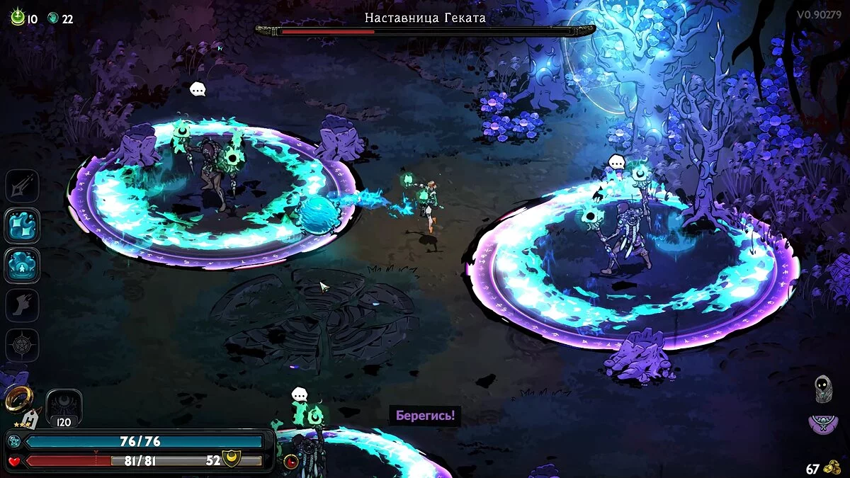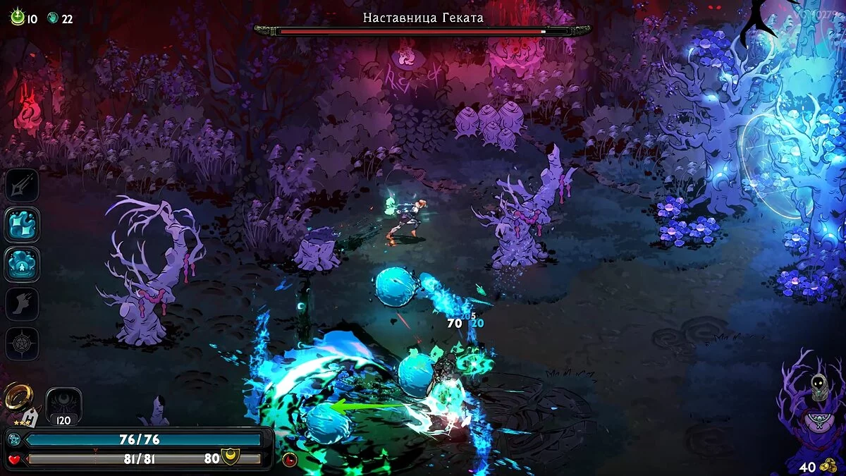 Как только защитный купол босса исчезнет, она снова выпустит магический круг. Остаёмся в стороне и бьём дальними атаками. Следующий сегмент похож на третий, когда Геката призывает двух клонов. Но на этот раз они выпускают большое количество магических шаров. Увернуться от них можно при помощи рывка либо с помощью особых даров, позволяющих блокировать дальние удары или создающие щит вокруг Мелинои.