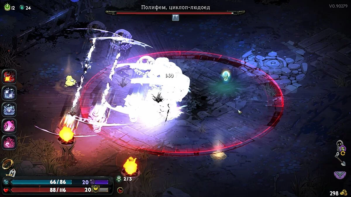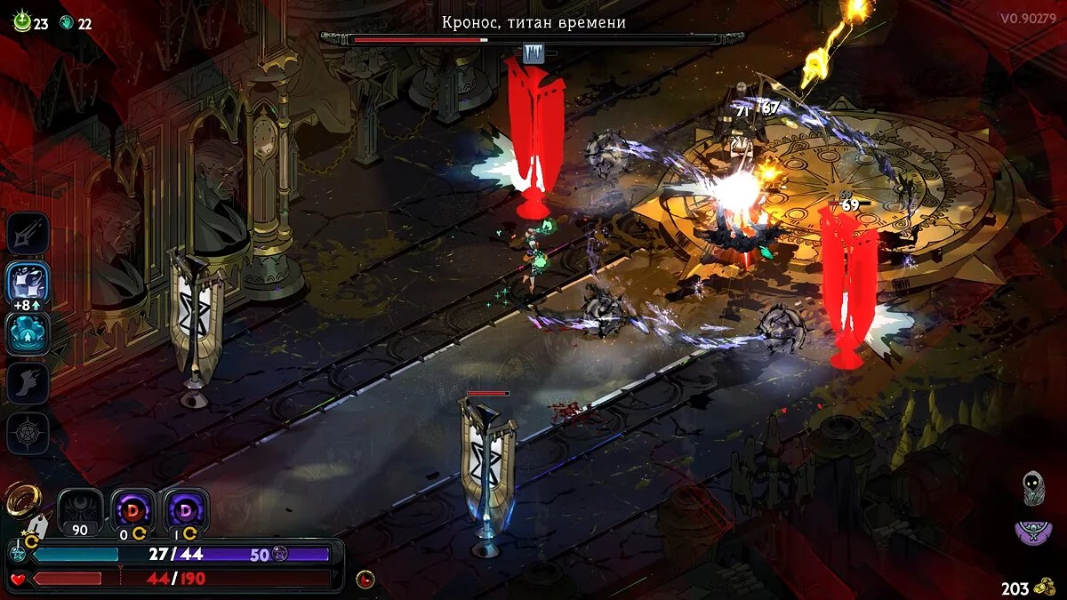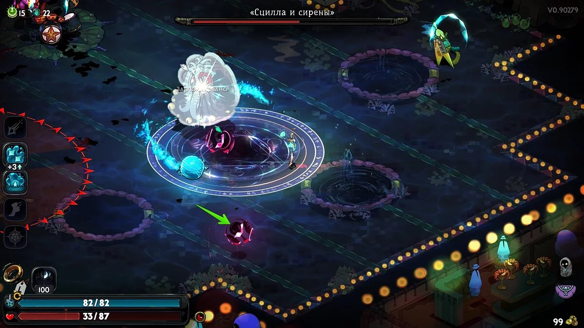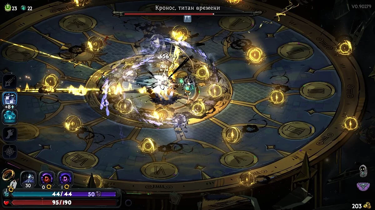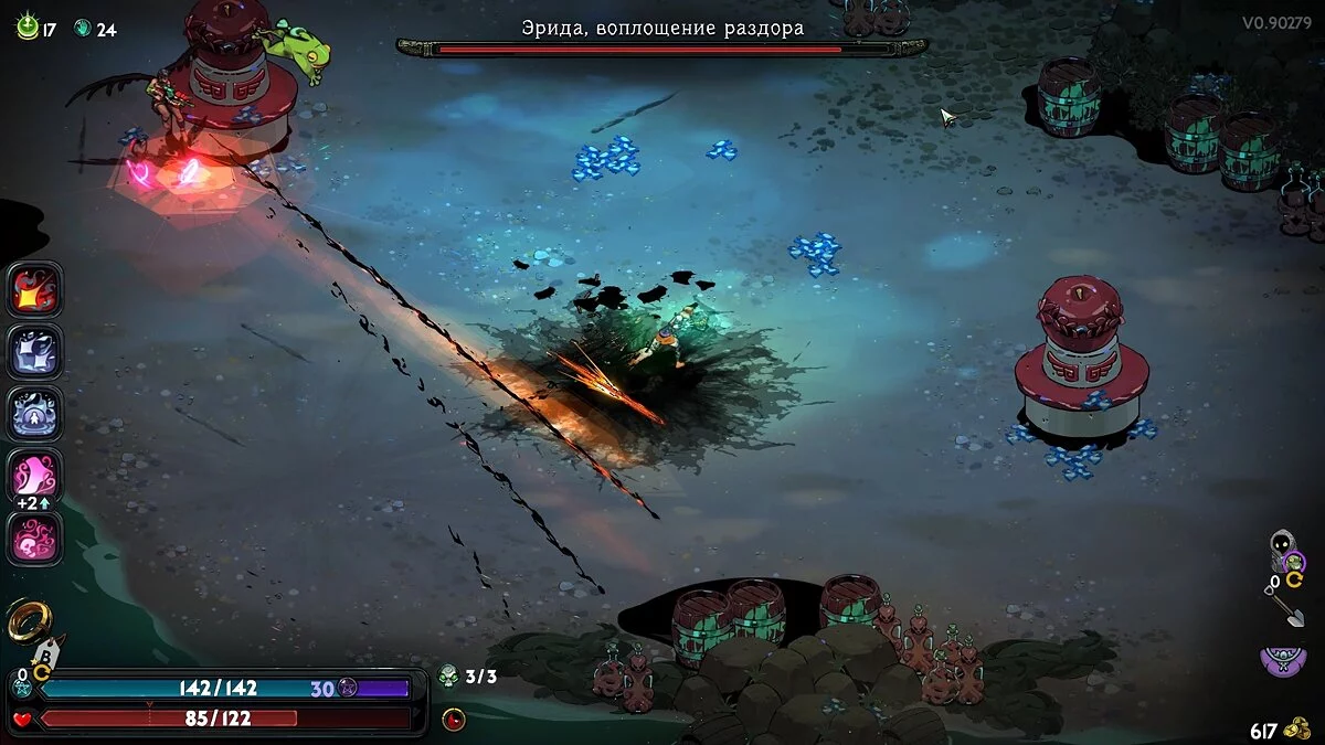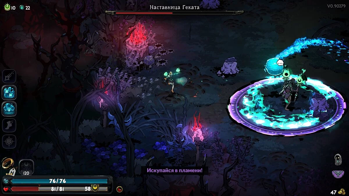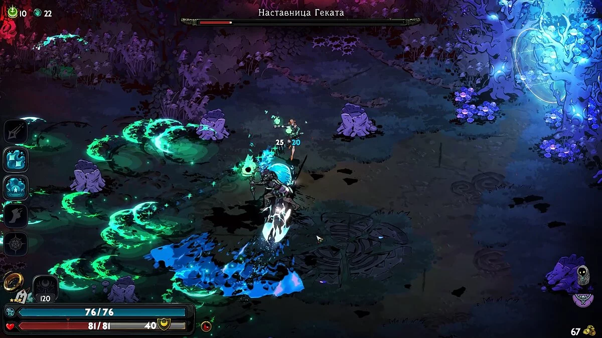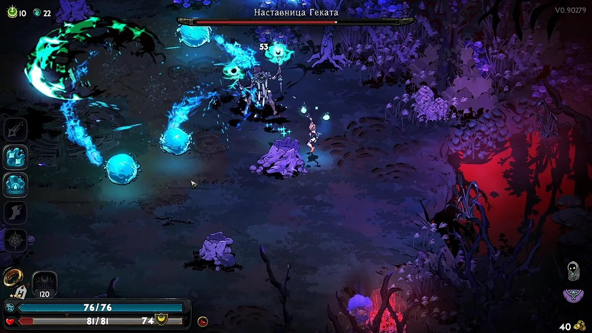 Как только защитный купол босса исчезнет, она снова выпустит магический круг. Остаёмся в стороне и бьём дальними атаками. Следующий сегмент похож на третий, когда Геката призывает двух клонов. Но на этот раз они выпускают большое количество магических шаров. Увернуться от них можно при помощи рывка либо с помощью особых даров, позволяющих блокировать дальние удары или создающие щит вокруг Мелинои.