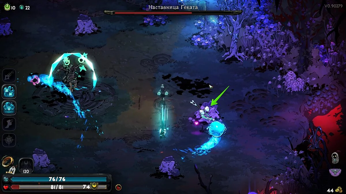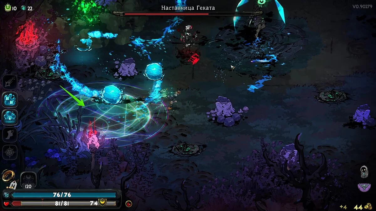 После этого подойдите вплотную, если ваш билд рассчитан на быстрые удары вблизи, чтобы атаковать босса. В следующие несколько секунд Геката дважды (а иногда трижды) атакует по области. Перед замахом делаем рывок в сторону противника или вниз/вверх. Отбегать не стоит, так как магическое облако догонит вас и нанесёт урон.