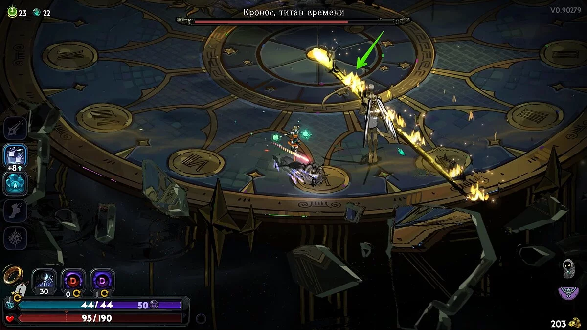 Здесь же вы встретитесь с повторяющимися атаками из предыдущей фазы: Кронос будет пытаться притянуть к себе Мелинои, а затем выпустит в неё скоп энергии. Вращающаяся коса также имеется, поэтому контролируйте данные атаки.