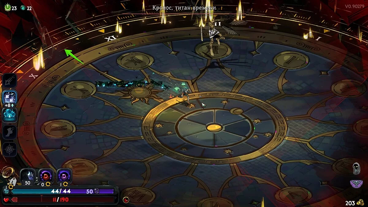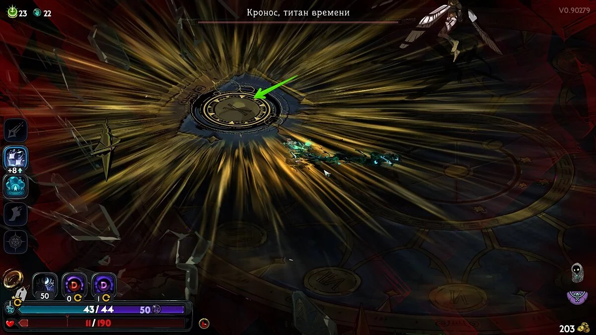 Через время на часах зажгутся стрелки. Используем рывок, чтобы не получить урон, когда будет пробегать мимо них. Отметим, что сперва появится длинная, минутная стрелка, а в следующий раз стрелок будет две: минутная и часовая.