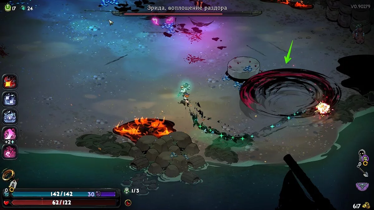 Босс же начнёт выполнять рывок в сторону протагониста, выпуская снаряды в две стороны. Увернуться довольно сложно: постарайтесь заметить подготовку к атаке и выполнить рывок в сторону Эриды. Так вы точно избежите урона.
