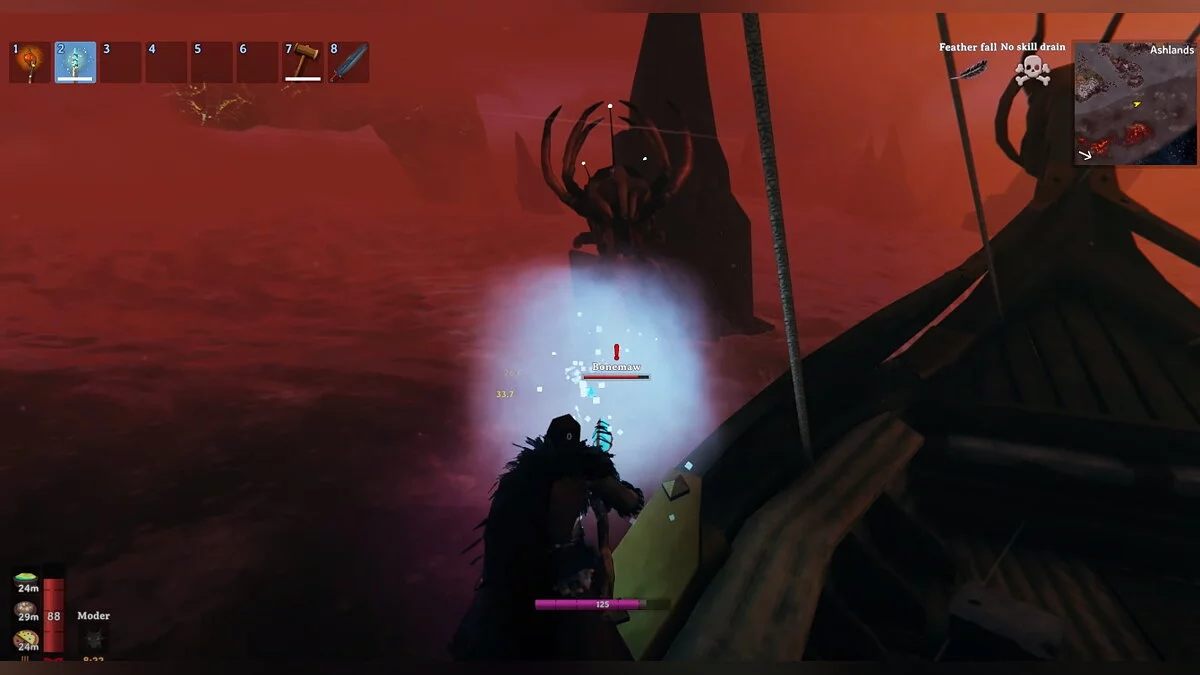 После этого на юге вашей карты появятся Пепельные земли. Чтобы попасть на их территорию, вам придётся преодолеть кипящие воды. Ни одна из лодок в игре не способна выдержать столь высокой температуры. Поэтому вам потребуется драккар, новый вид мореплавательных кораблей, который был добавлен в обновлении Ashlands.