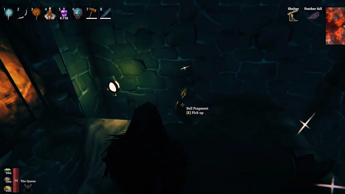 - Постройте осадное орудие и штурмуйте обугленные крепости. В них вам нужно найти девять фрагментов колокола. Потребуется обчистить как минимум три таких замка. Там же нужно отыскать Изумрудное пламя Вегвизира, чтобы найти путь к арене с боссом.