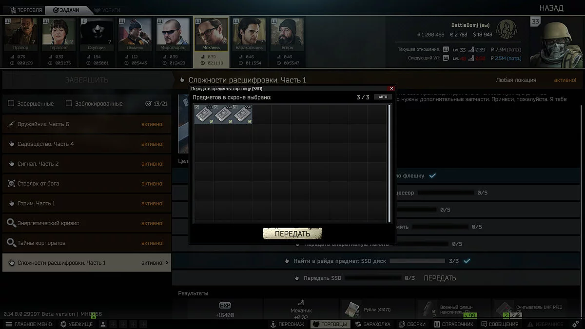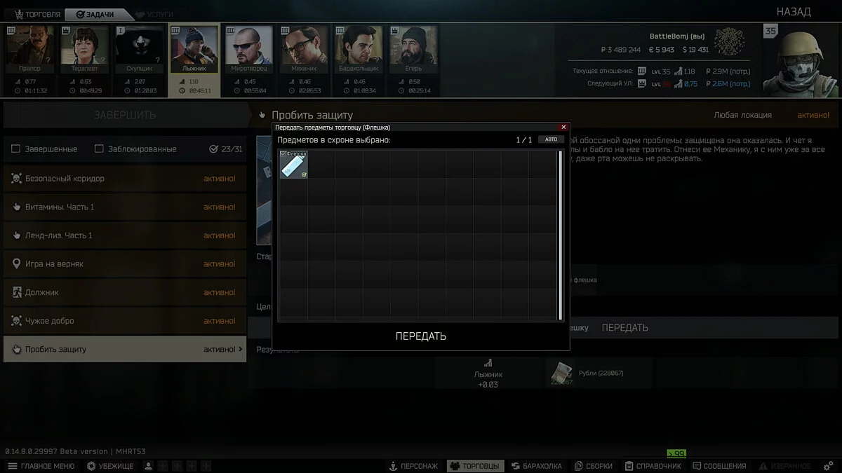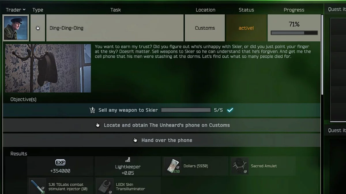 Это задание доступно всем желающим у Лыжника. Просто перейдите в раздел «Торговцы» и выберите «Задачи», чтобы отследить его. Оно появится, даже если на трейдере нет галочки доступных заданий.