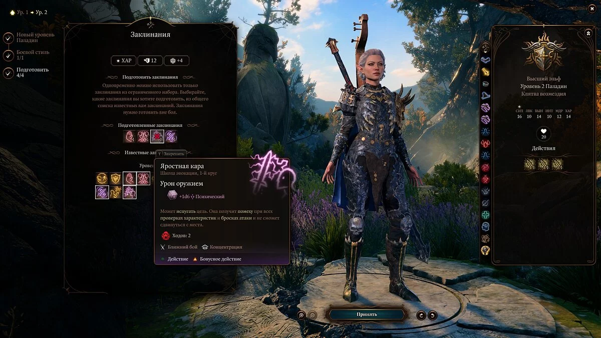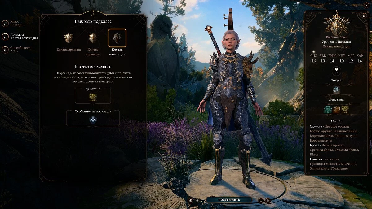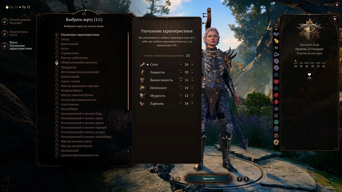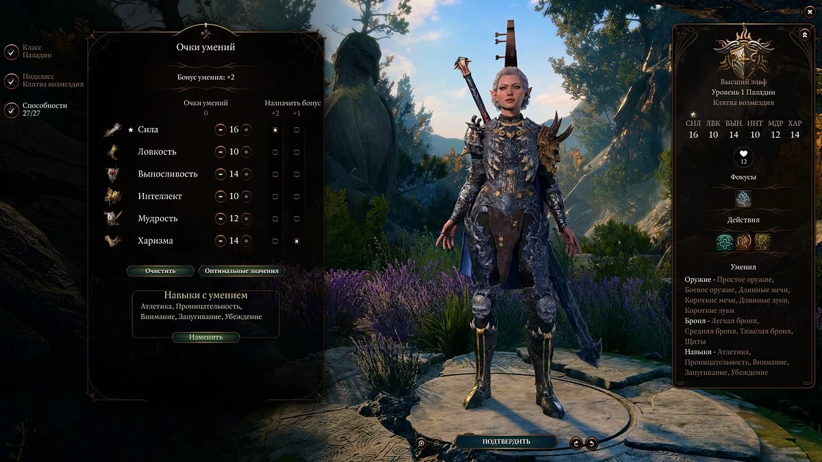 Также важно учитывать ваши характеристики. Основная у паладина — «Сила», но не менее важны для него «Телосложение» и «Харизма». Первое — ваш урон, второе — здоровье, а третье — колдовская характеристика.