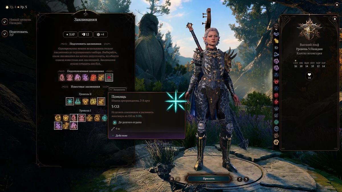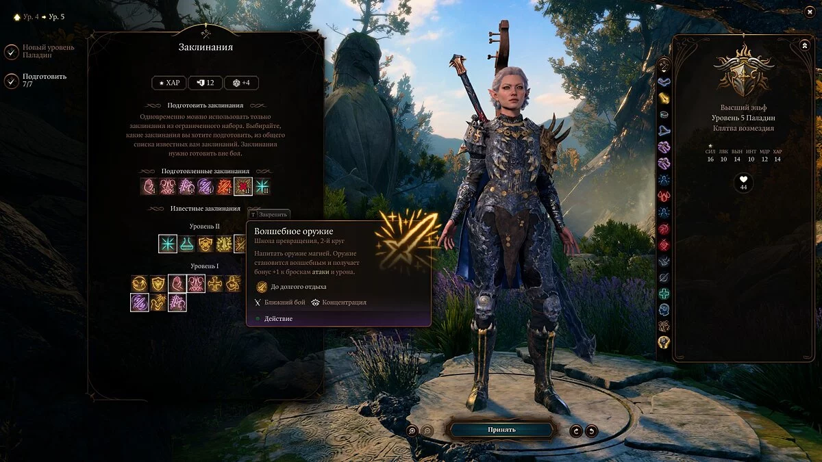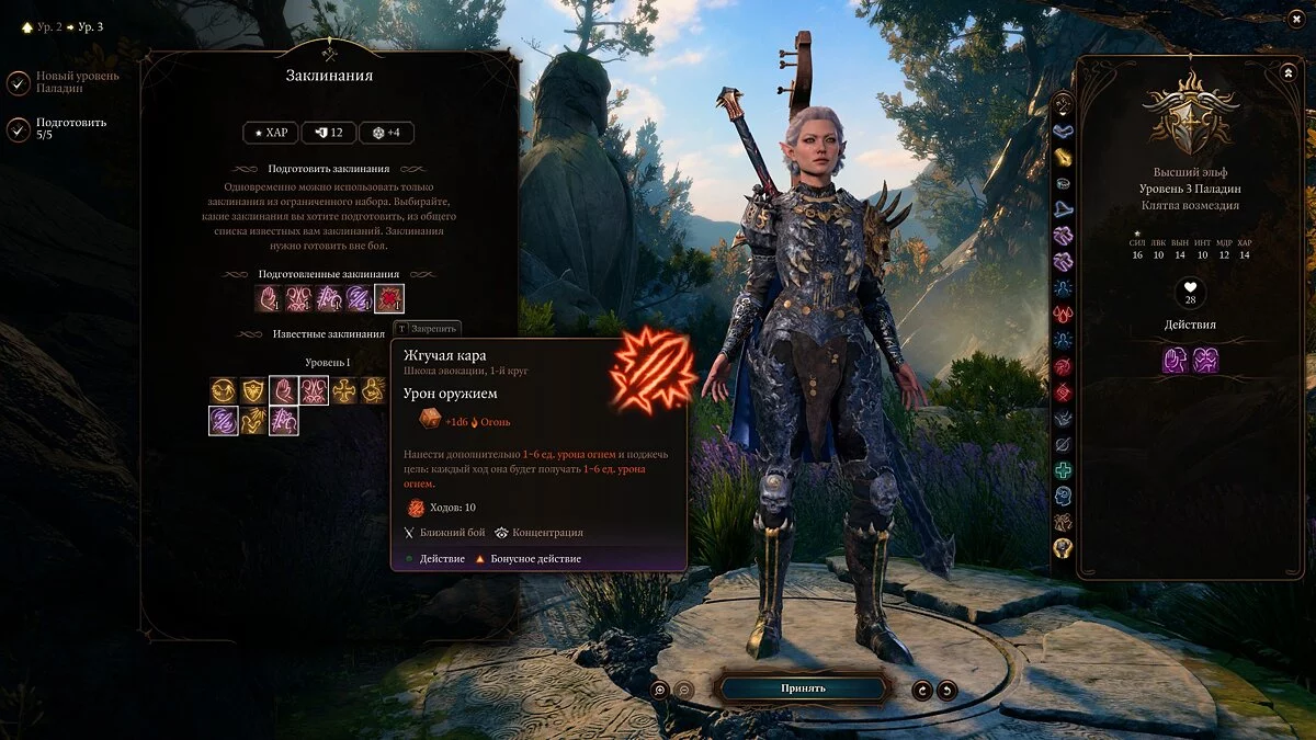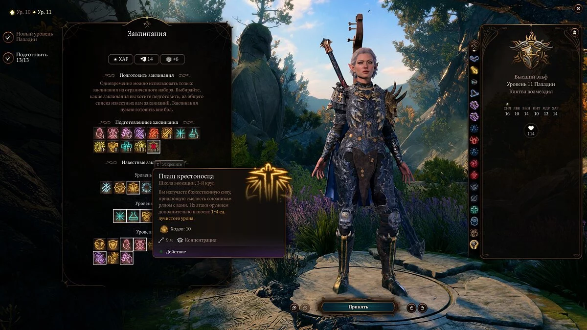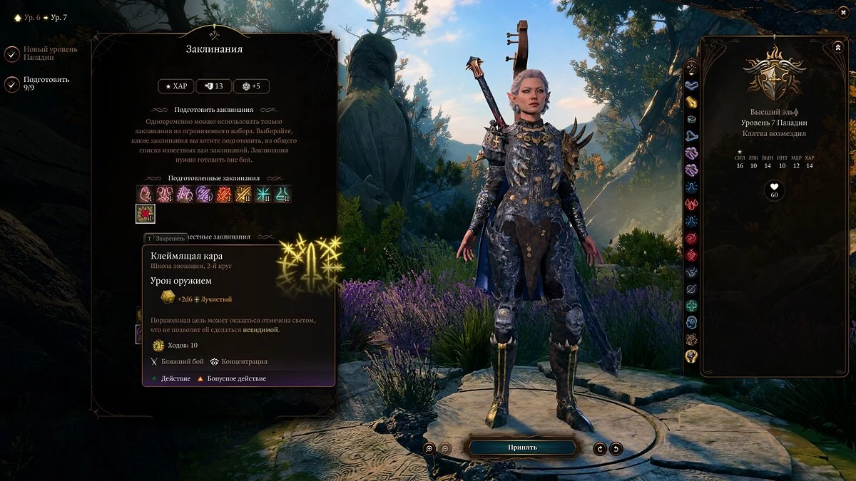 Также важно учитывать ваши характеристики. Основная у паладина — «Сила», но не менее важны для него «Телосложение» и «Харизма». Первое — ваш урон, второе — здоровье, а третье — колдовская характеристика.