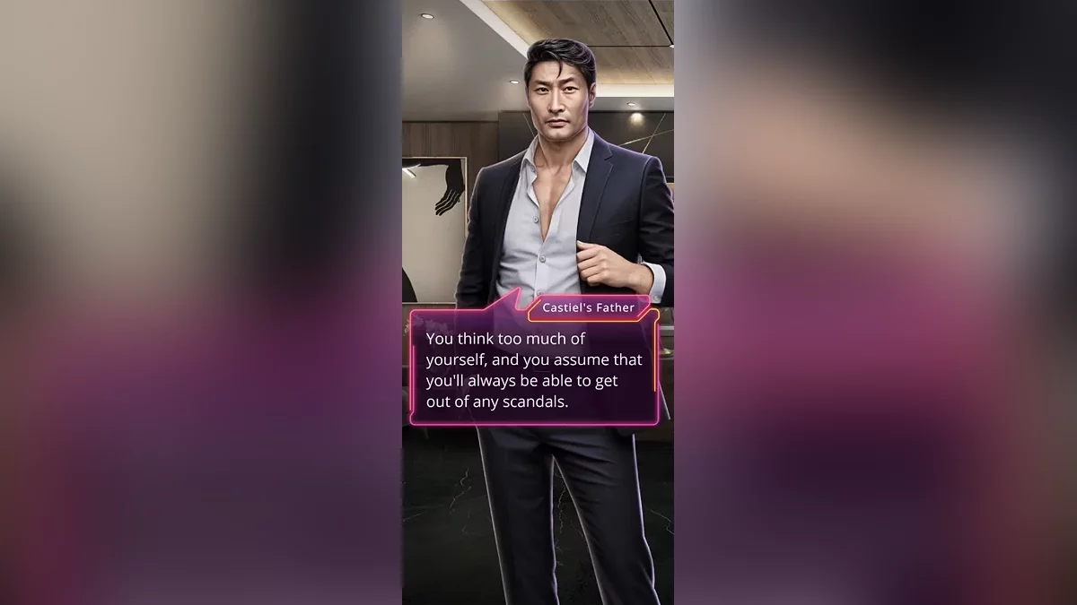 Вы услышали диалог Кастиэля с незнакомым мужчиной. Оказывается, это недовольный отец певца, который отчитывает айдола. Он возмущён, что деньги утекают, а прибыли нет. А когда парень попытался возразить, мужчина нанёс ему удар в живот.