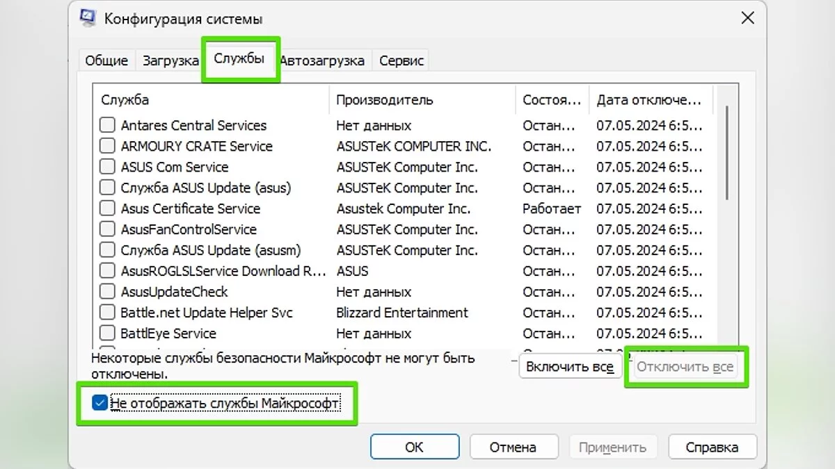 - Поставьте галочку «Не отображать службы Microsoft»;