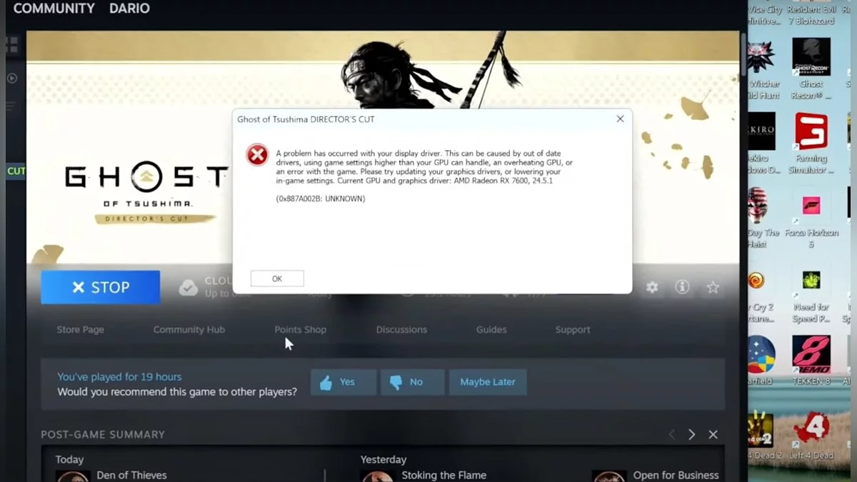 Возникла проблема с драйвером в Ghost of Tsushima на ПК. Игра вылетает во время диалогов и катсцен