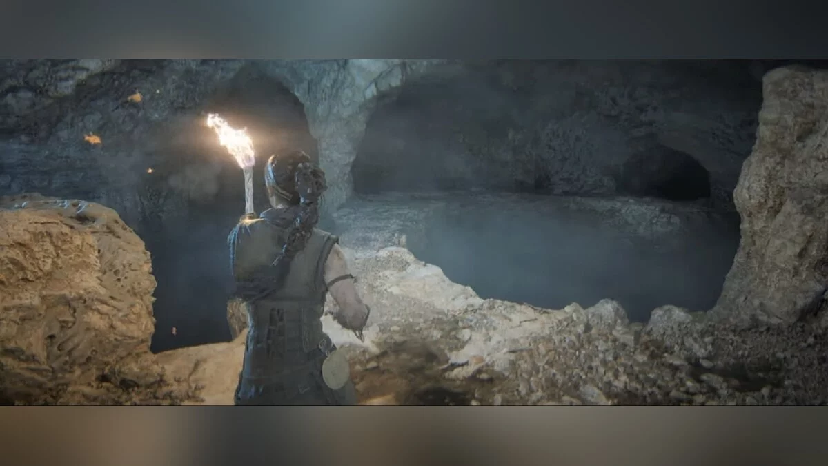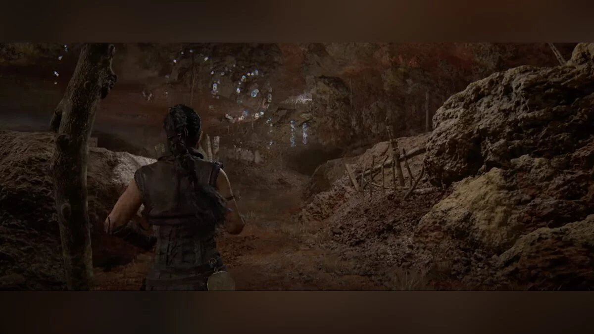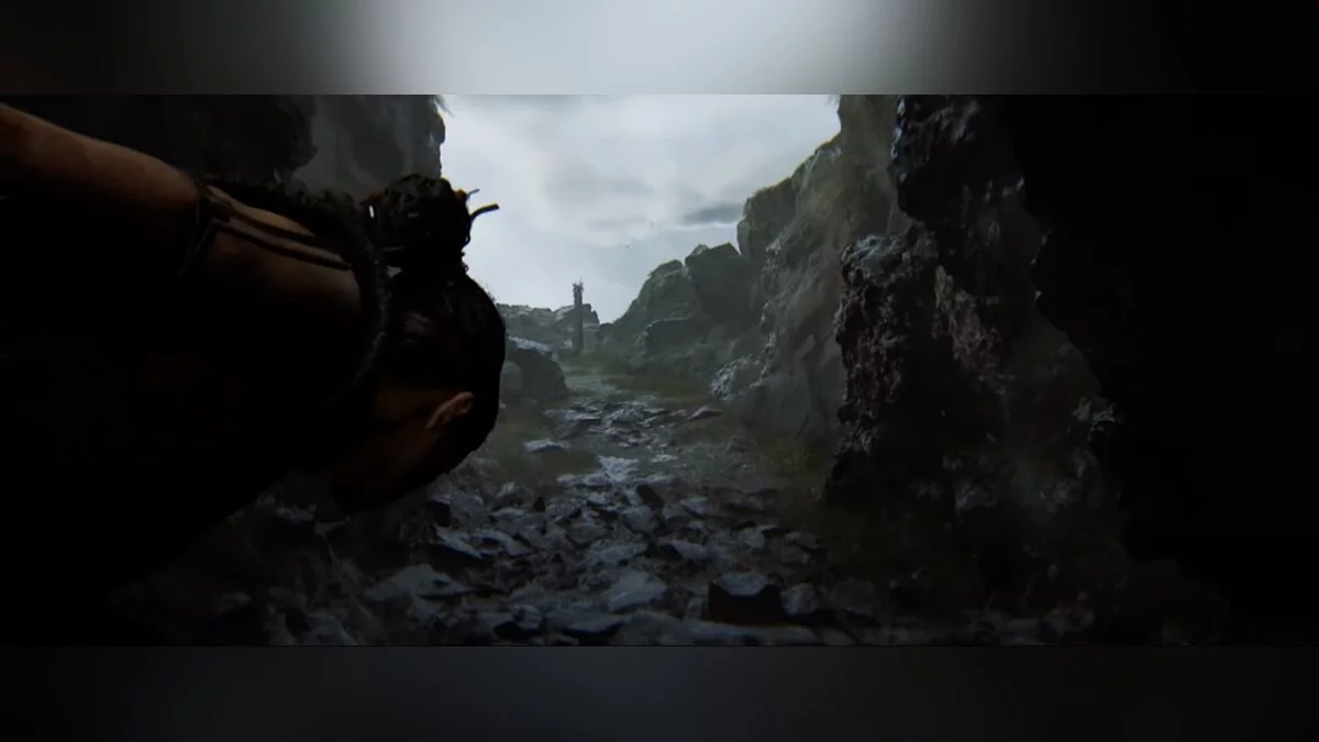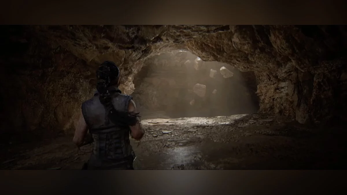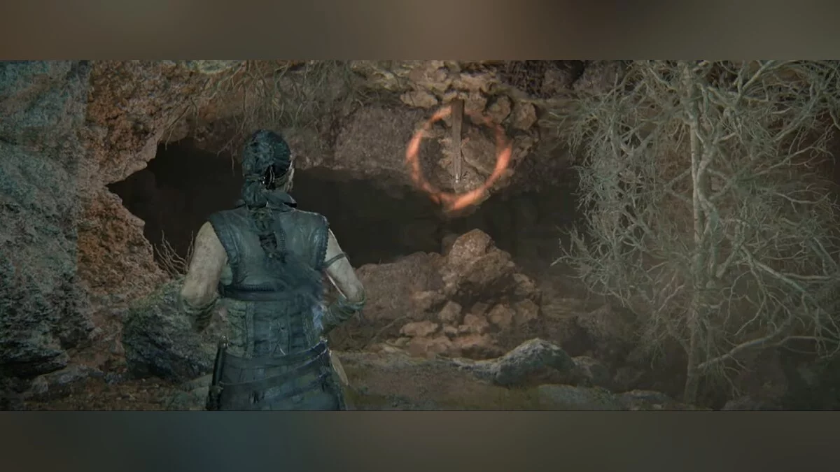 Когда Сенуа лишится меча, пройдите за светом и сбегите от монстров. Вы попадете в освещенную солнцем пещеру, где в воздухе парят камни. Смотрите на левую сторону, чтобы обнаружить лицо.