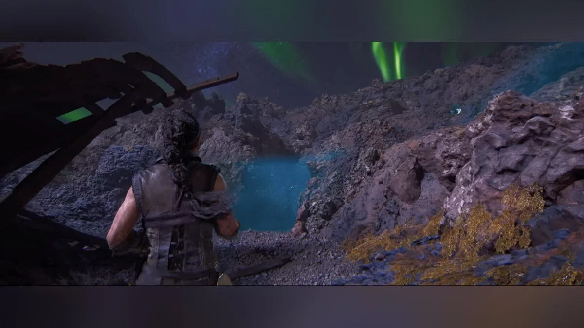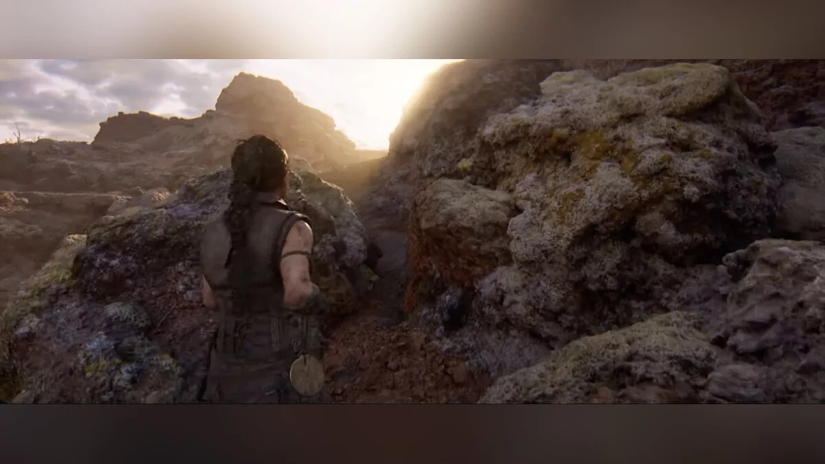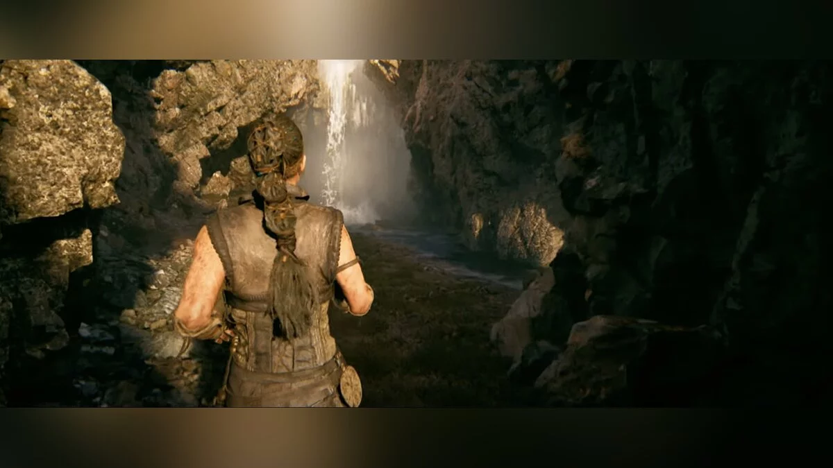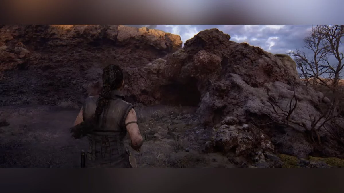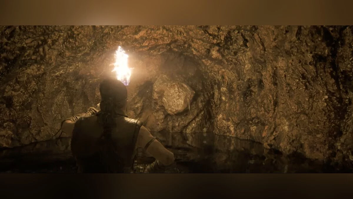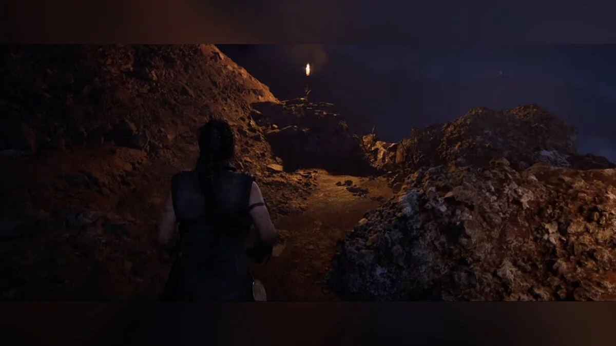 Когда Сенуа лишится меча, пройдите за светом и сбегите от монстров. Вы попадете в освещенную солнцем пещеру, где в воздухе парят камни. Смотрите на левую сторону, чтобы обнаружить лицо.