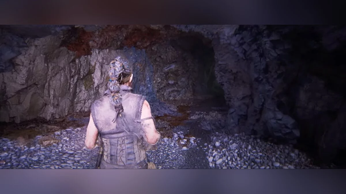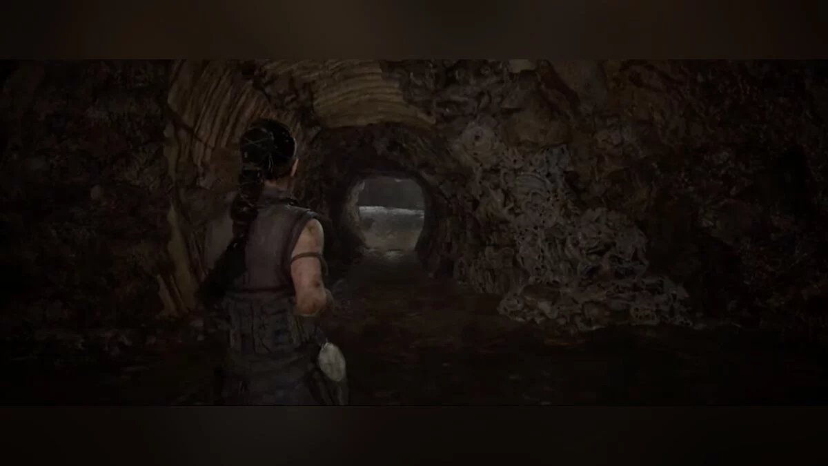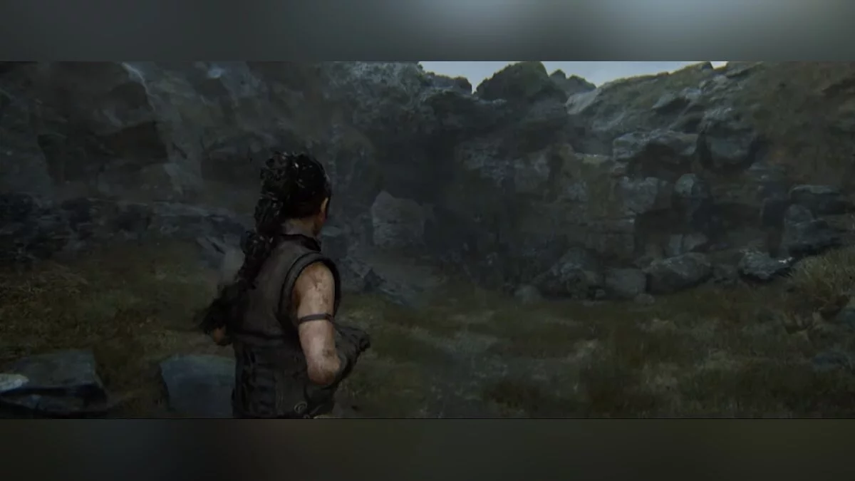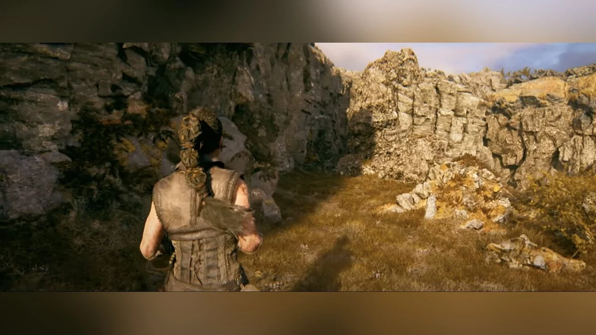 Как только Сенуа останется вдвоем с Астридр, следуйте за девушкой. Дойдите до этапа, где нужно протиснуться через расщелину. Прежде чем это сделать, осмотрите правую сторону — каменное лицо.