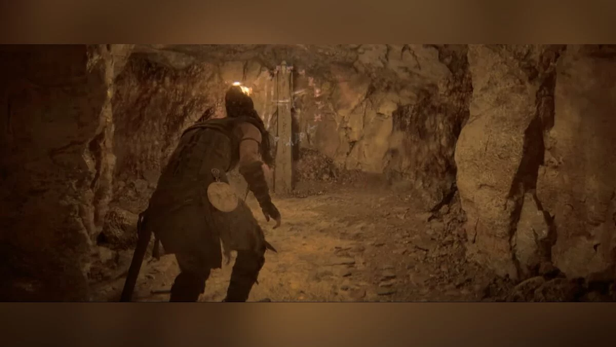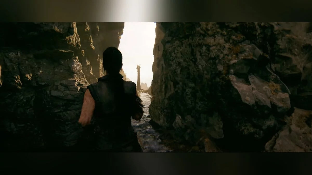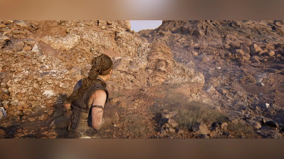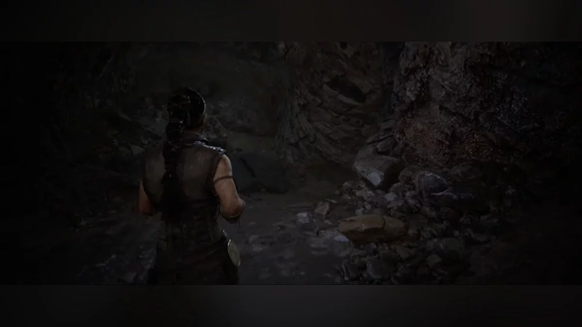 Как только Сенуа останется вдвоем с Астридр, следуйте за девушкой. Дойдите до этапа, где нужно протиснуться через расщелину. Прежде чем это сделать, осмотрите правую сторону — каменное лицо.