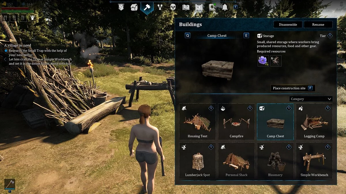 После разговора со старостой найдите подходящее место для вашего будущего лагеря. Постарайтесь выбрать место рядом с водой и ресурсами. Постройте там личный шалаш, который станет вашим временным убежищем. Пока не наступила ночь, собирайте доступные ресурсы: древесину, камень, ягоды и другие. Можете построить дополнительные шалаши для ваших будущих поселенцев.