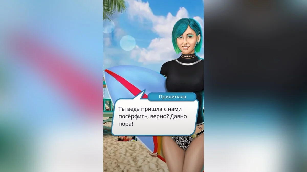 Прилипала и Губка поприветствовали вас. Вы показали фото Шелли и обрисовали ситуацию. Парень видел её вместе с парнями и девушками, которые отдыхали на соседнем пляже. Ваша героиня решила пойти туда. Но перед этим вы заскочили домой и забрали доску для сёрфинга. Можно присоединиться к другим спортсменам и аккуратно выведать информацию. На пляже вы заметили несколько винтажных фургонов.