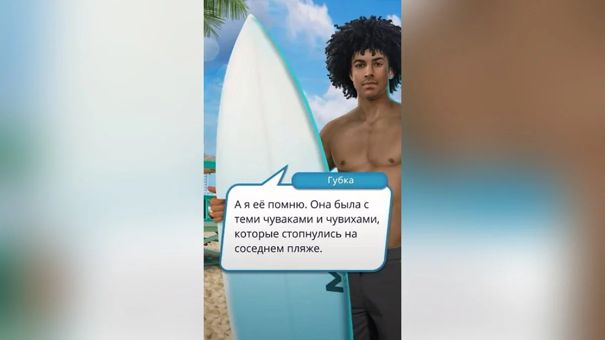 Джейк заметил, что Шелли ушла вместе с компанией волейболистов. Они двигались в сторону второй вышки. Вы двинулись к ней. По пути ваша героиня пришла к мысли, что новые знакомые могут быть как-то связаны с исчезновением девушки. Но вы не успели добраться до Райана, как вас окликнула Кайла. Она решила развеяться на пляже после вчерашнего. Вы признались, что потеряли Шелли и заняты её поисками. Девушка предложила спросить Губку и Прилипалу, которые были тут вчера.