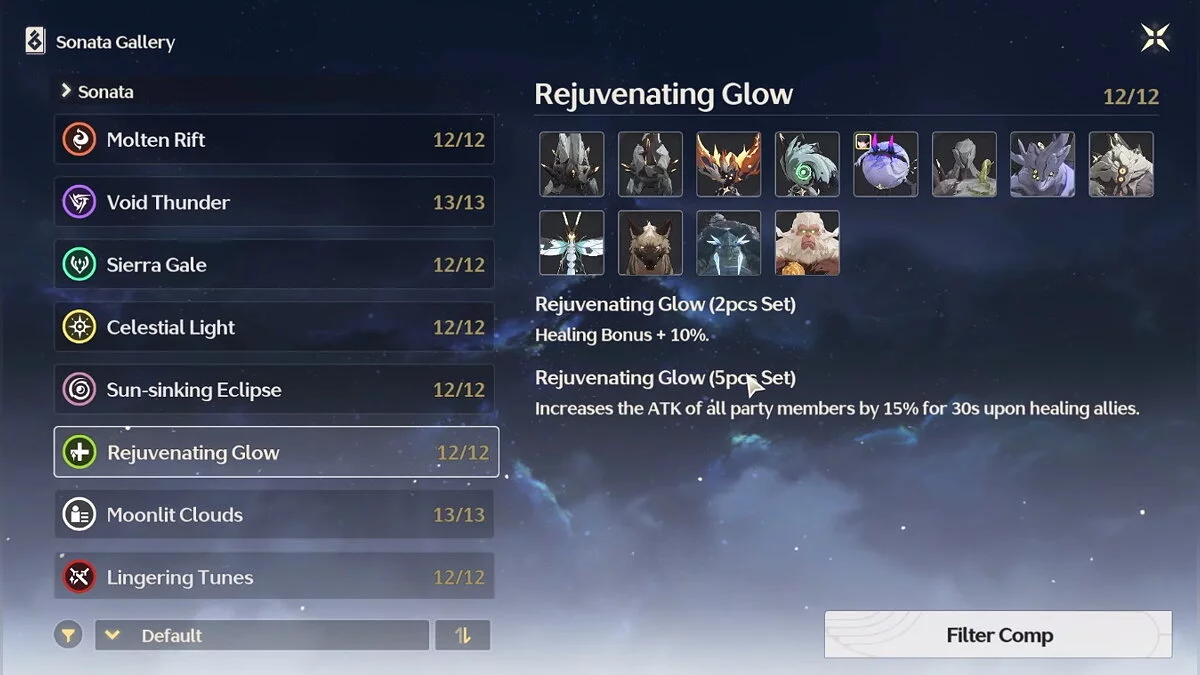 Во время выбора основных и второстепенных артефактов стоит учитывать не только их характеристикам, но и то, как они сочетаются друг с другом. В идеале стоит собрать предметы одной стихии, чтобы получить эффекты Сонаты (Sonata Effect). \