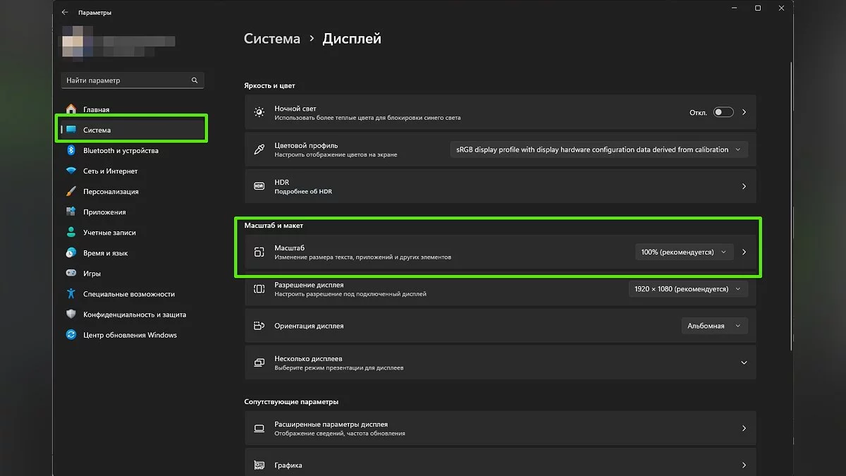 - В разделе «Масштаб и макет» найдите «Масштаб» и установите значение на 100% или 125% (установите рекомендуемое значение системой). Если это значение уже установлено, выберите другое и проверьте, появляется ли ошибка.