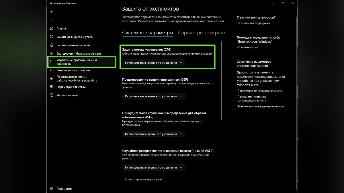- Откроется окно системных параметров, где вам нужно отследить раздел «Защита потока управления»;