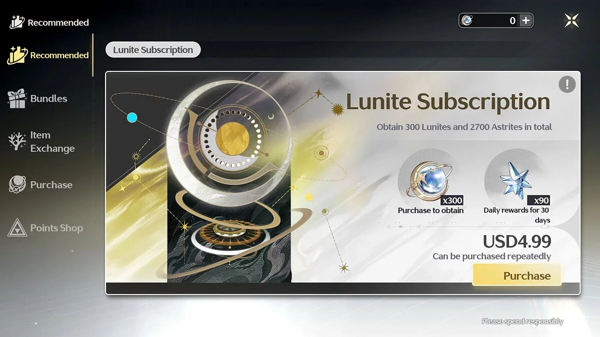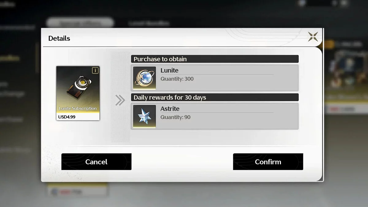 Подписка на Луниты приобретается один раз в месяц. Вы сразу получите 300 Лунитов, а затем каждый день вам будут давать по 90 Астридов. Не забывайте забирать их вовремя, иначе они сгорят! Эту валюту можно менять на Лучезарные приливы (Radiant Tide), при помощи которых осуществляются крутки в местной гача-системе. Таким образом вы можете получить лучших персонажей и оружие для них.