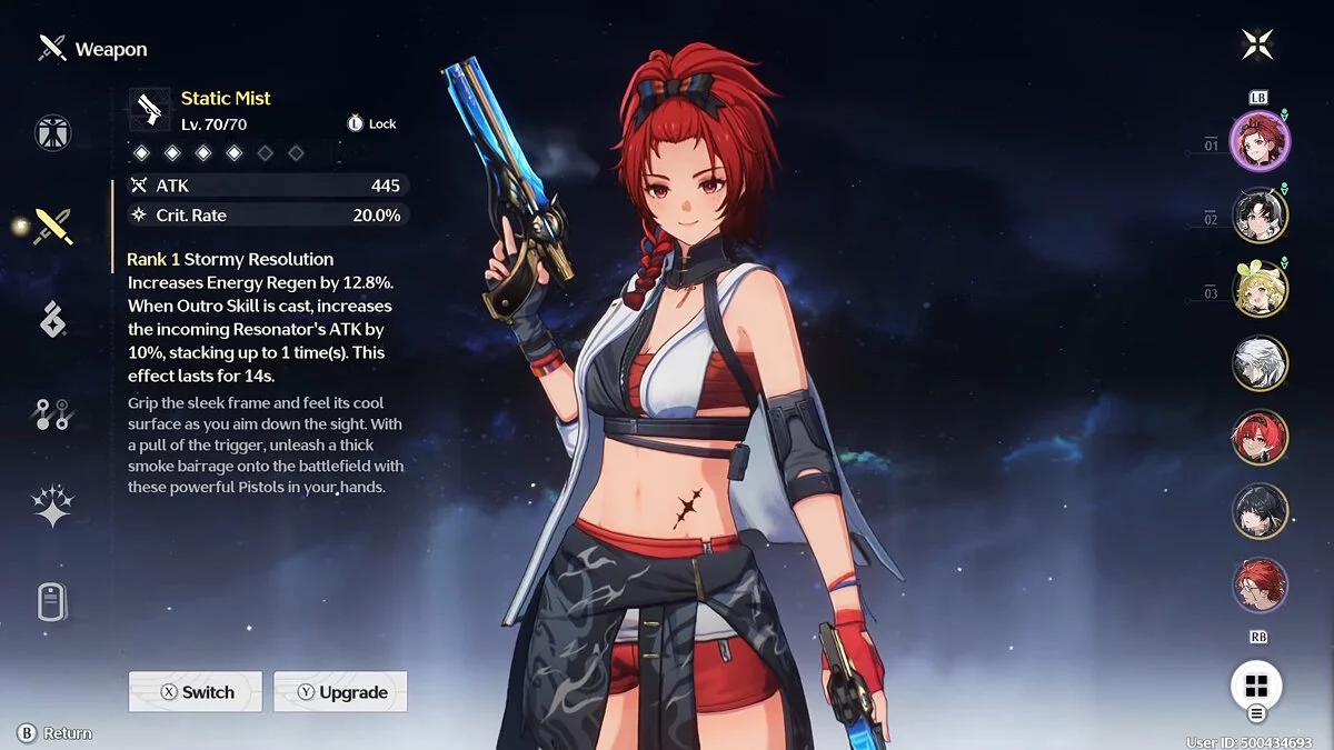 Статический туман (Static Mist) — это мощный 5-звездочный пистолет, который существенно увеличивает шанс критического урона Чиксии (Chixia) и повышает её регенерацию энергии. Но поскольку героиня лучше всего раскрывается на ранних этапах прохождения, у вас, скорее всего, не будет этого оружия. В качестве альтернативы можете использовать 4-звездочный Удар молнии (Thunderbolt). Этот пистолет увеличивает бонус к урону от навыка резонанса на 7% до трех раз при нанесении базовых или тяжелых атак, которые вы будете часто использовать этим персонажем.