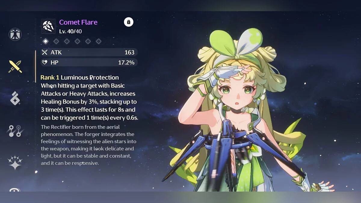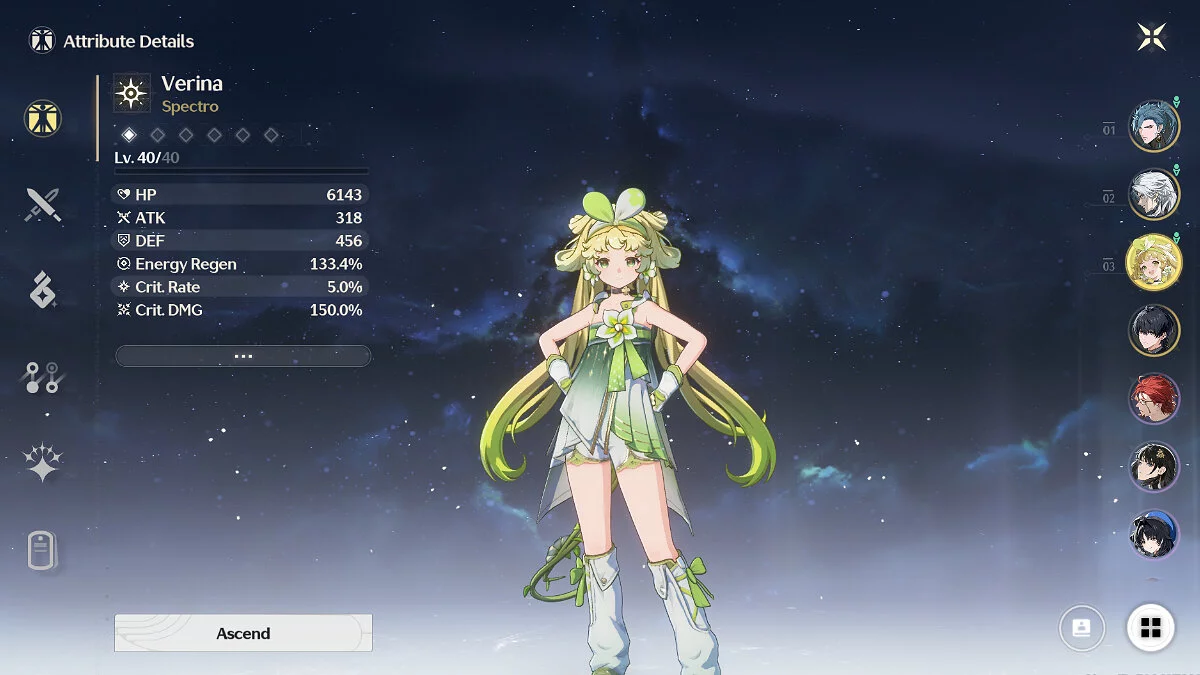 Хотя Верина — героиня поддержки, которая лечит союзников и увеличивает их урон, для неё важно подобрать мощное оружие. Дело в том, что эффективность умений героини напрямую зависит от её силы атаки. Также стоит уделять внимание восполнению энергии, чтобы можно было чаще применять резонансные навыки.
